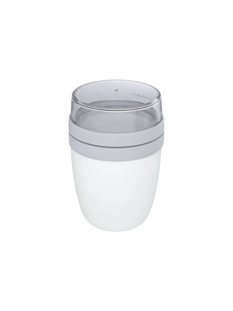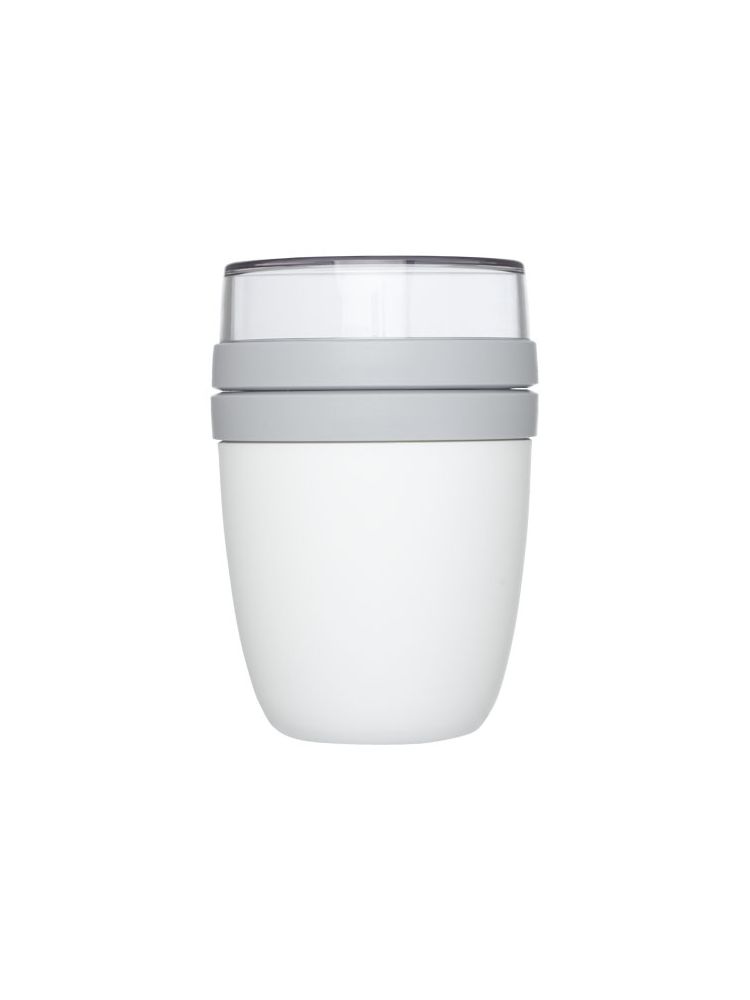 Pojemnik na lunch z dwiema komorami, aby oddzielenie przechowywać różne składniki. Oba pojemniki mają oddzielne pokrywy i dlatego pozostają czyste. Pojemność górnego przezroczystego pojemnika wynosi 200 ml, co oznacza, że może pomieścić około 75 gramów żywności w formie stałej. Pojemność dolnego pojemnika wynosi 500 ml. Wykonane z trwałego materiału, dzięki czemu mogą być przechowywane w zamrażarce oraz stosowane w kuchence mikrofalowej (należy zdjąć pokrywę) i zmywarce. Górnego przezroczystego pojemnika nie należy używać w kuchence mikrofalowej. Wodoszczelne. Nie zawiera BPA.