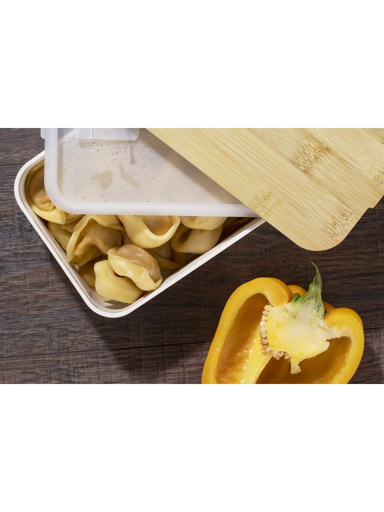 Pojemnik na żywność SINGLE wykonany jest z tworzywa, posiada bambusową przykrywkę i gumkę zapobiegającą przypadkowemu otwarciu. Posiada jedną komorę. Pojemnik może być używany w zmywarce, kuchence mikrofalowej i zamrażarce.