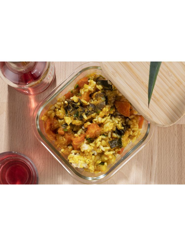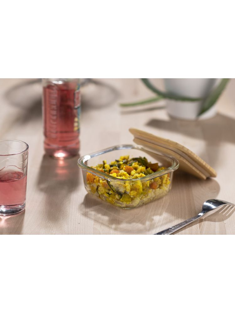 Pojemnik na żywność SOLA wykonany jest z wysokiej jakości szkła borokrzemowego. Pojemnik posiada przykrywkę z naturalnego bambusa. Można go stosować jako pojemnik lunchowy, jako pojemnik do przechowywania żywności, a ponadto można w nim podgrzewać potrawy w piekarniku lub kuchence mikrofalowej. Pojemność 350 ml.