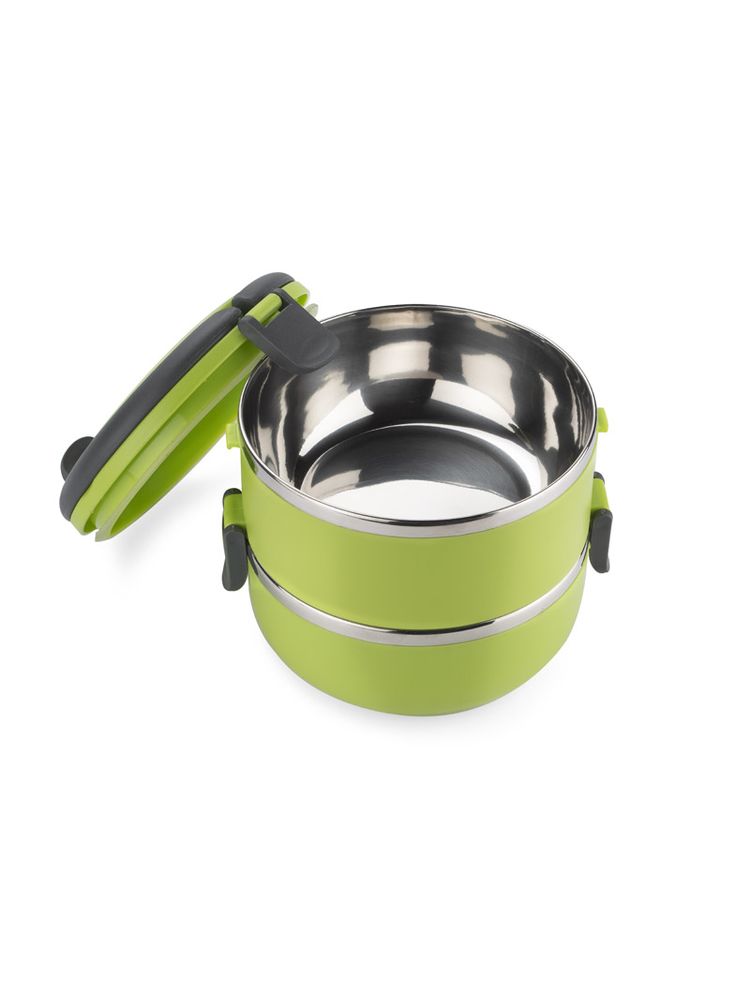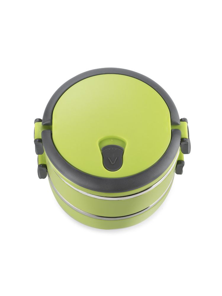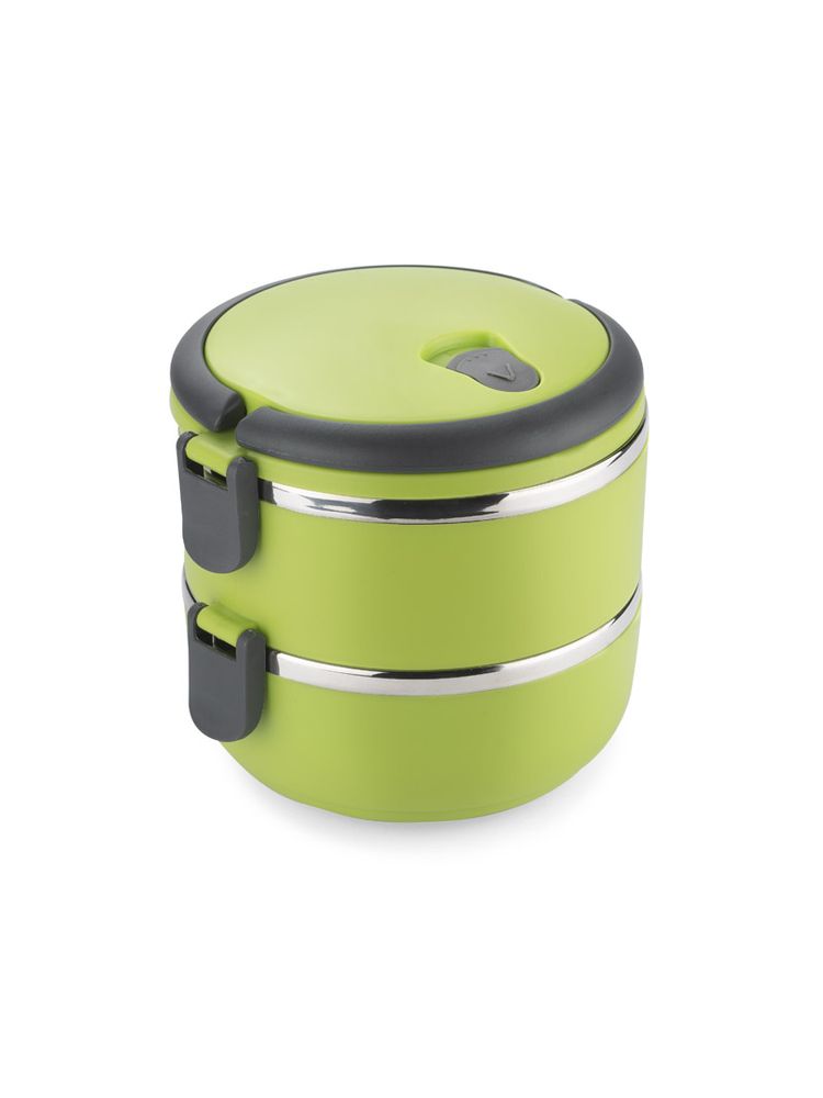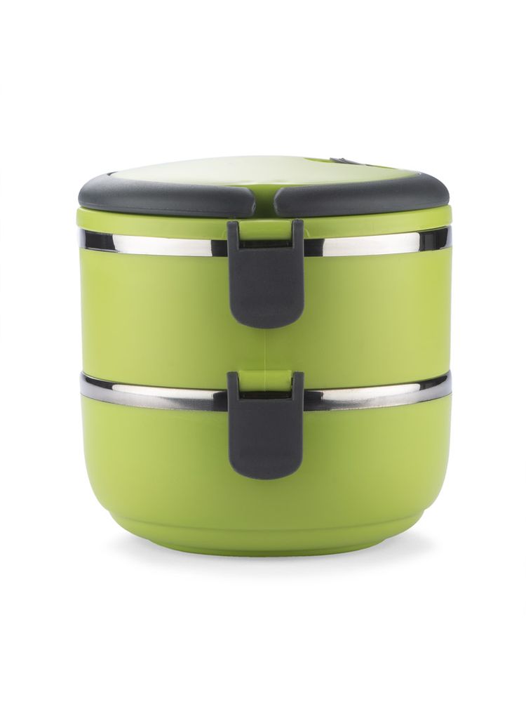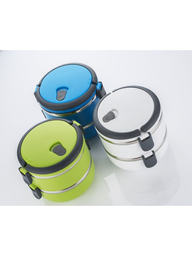 Pojemnik z wnętrzem ze stali nierdzewnej podzielony na dwie komory, które składamy jedną na drugą, co zapewnia poręczne i wygodne przenoszenie dwudaniowych posiłków. Górna komora wyposażona w uszczelkę. Uchwyty z tworzywa sztucznego z możliwością złożenia. Łączna pojemność: 1400 ml.