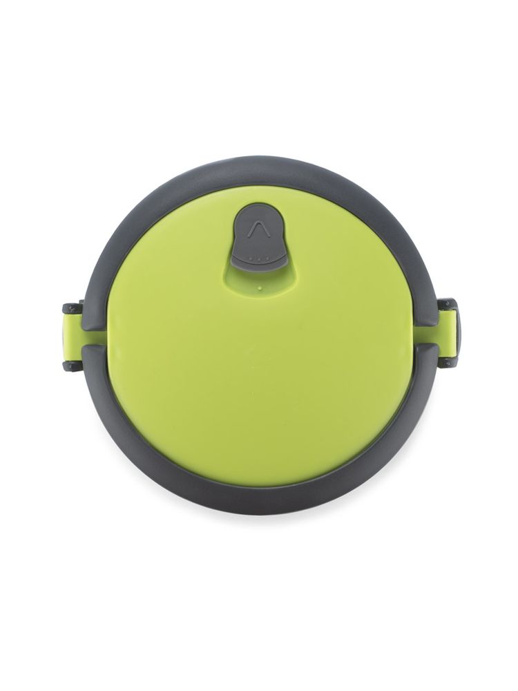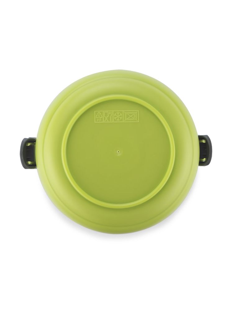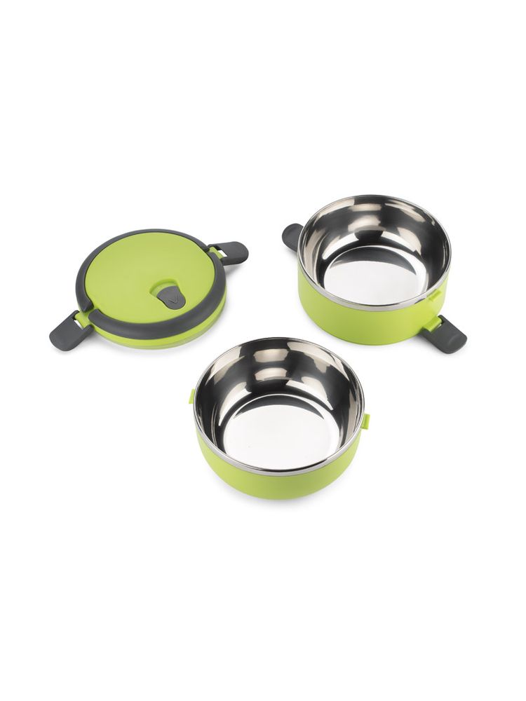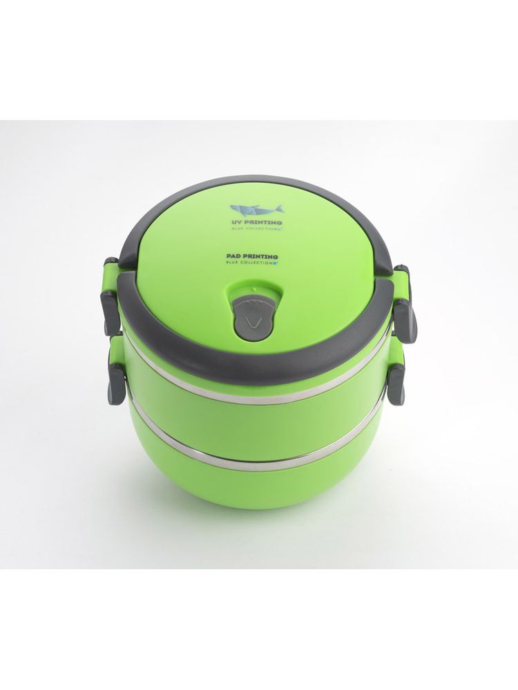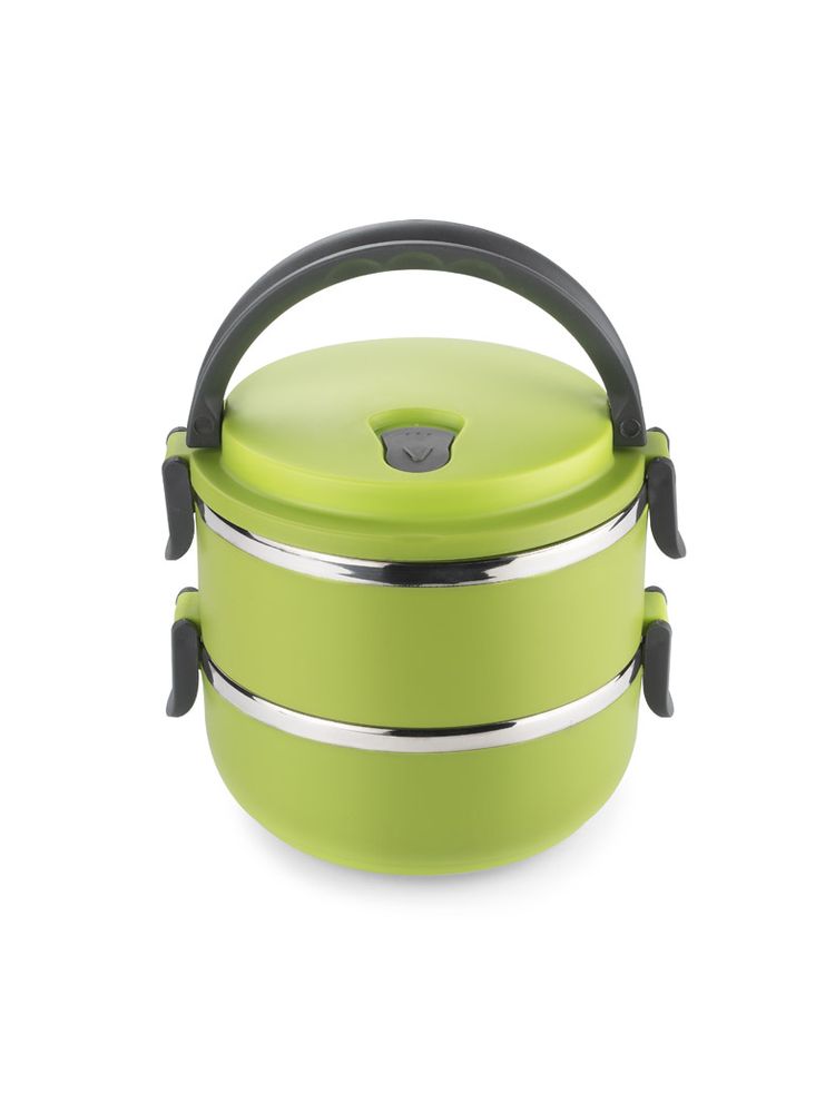 Pojemnik z wnętrzem ze stali nierdzewnej podzielony na dwie komory, które składamy jedną na drugą, co zapewnia poręczne i wygodne przenoszenie dwudaniowych posiłków. Górna komora wyposażona w uszczelkę. Uchwyty z tworzywa sztucznego z możliwością złożenia. Łączna pojemność: 1400 ml.