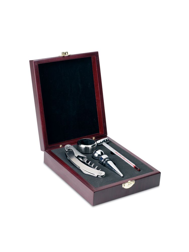 Elegancki komplet do wina w drewnianym pudełku. W zestawie: zatyczka, korkociąg, kołnierz i termometr.
