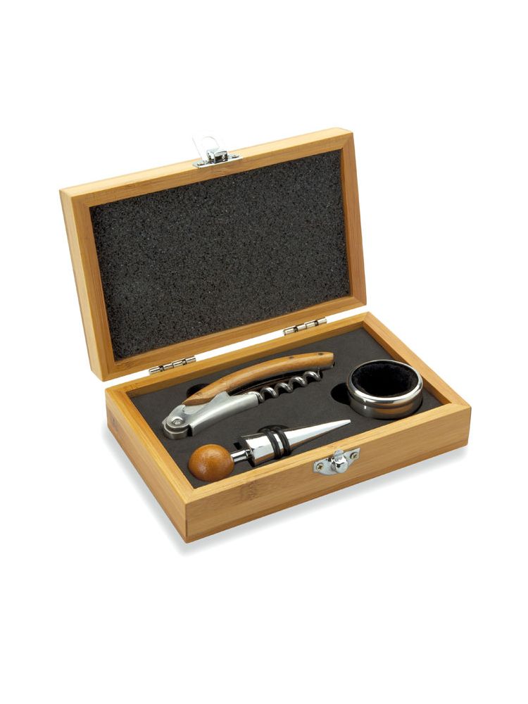 Zestaw do wina w bambusowym pudełku zawiera korkociąg, kołnierz do wina i korek ze stali nierdzewnej i bambusa. Bambus jest produktem naturalnym, dlatego mogą wystąpić nieznaczne różnice w kolorze, wzorze i rozmiarze.