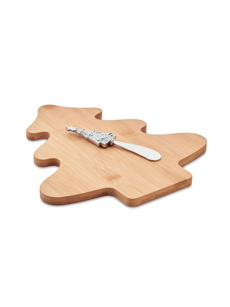 Zestaw z bambusową deską i nożem do serów. Nóż wykonany ze stali nierdzewnej. Bambus jest produktem naturalnym, dlatego mogą występować niewielkie różnice w kolorze i rozmiarze poszczególnych elementów, co może mieć wpływ na ostateczny efekt zdobienia.