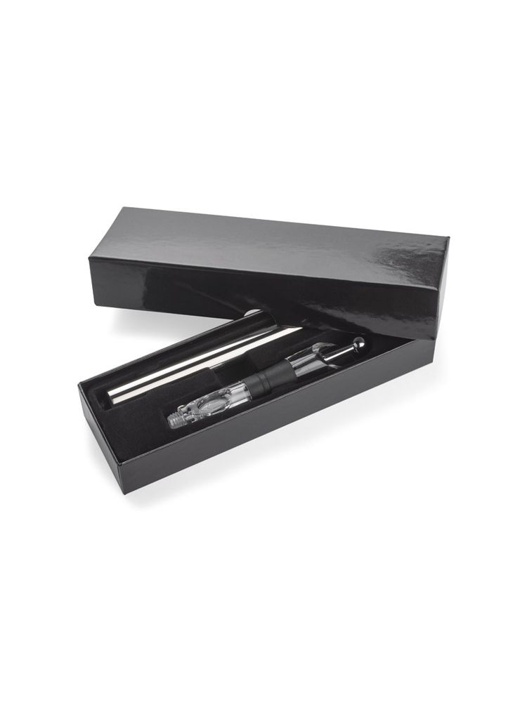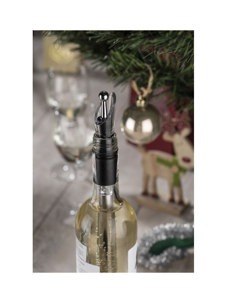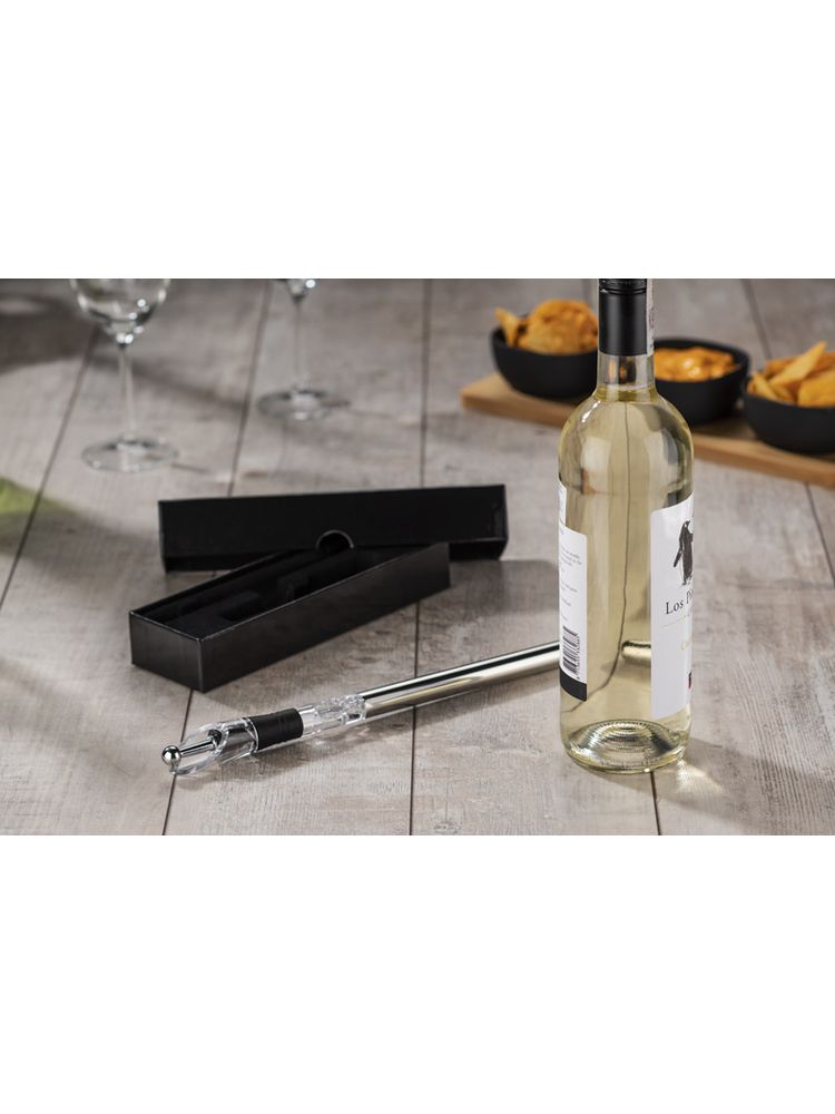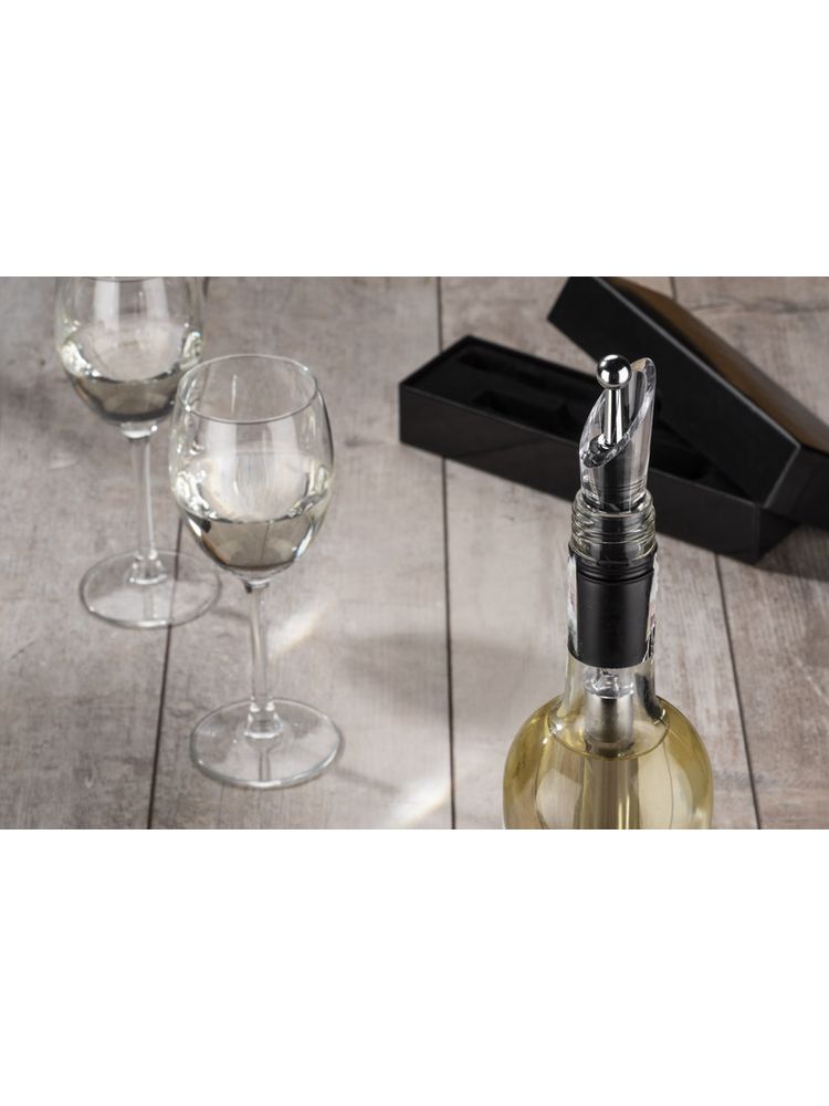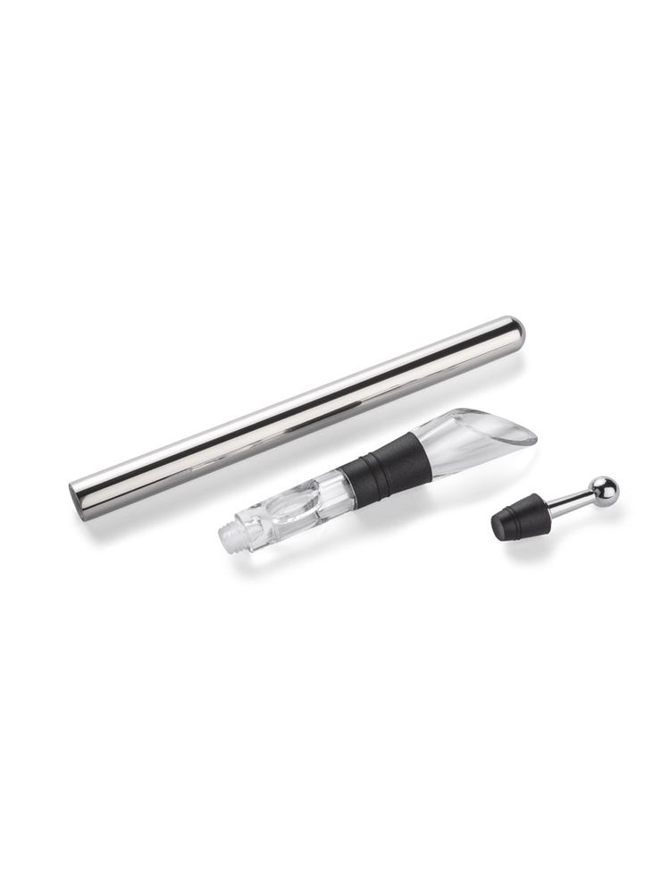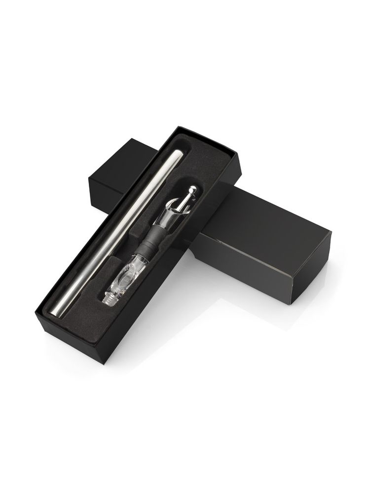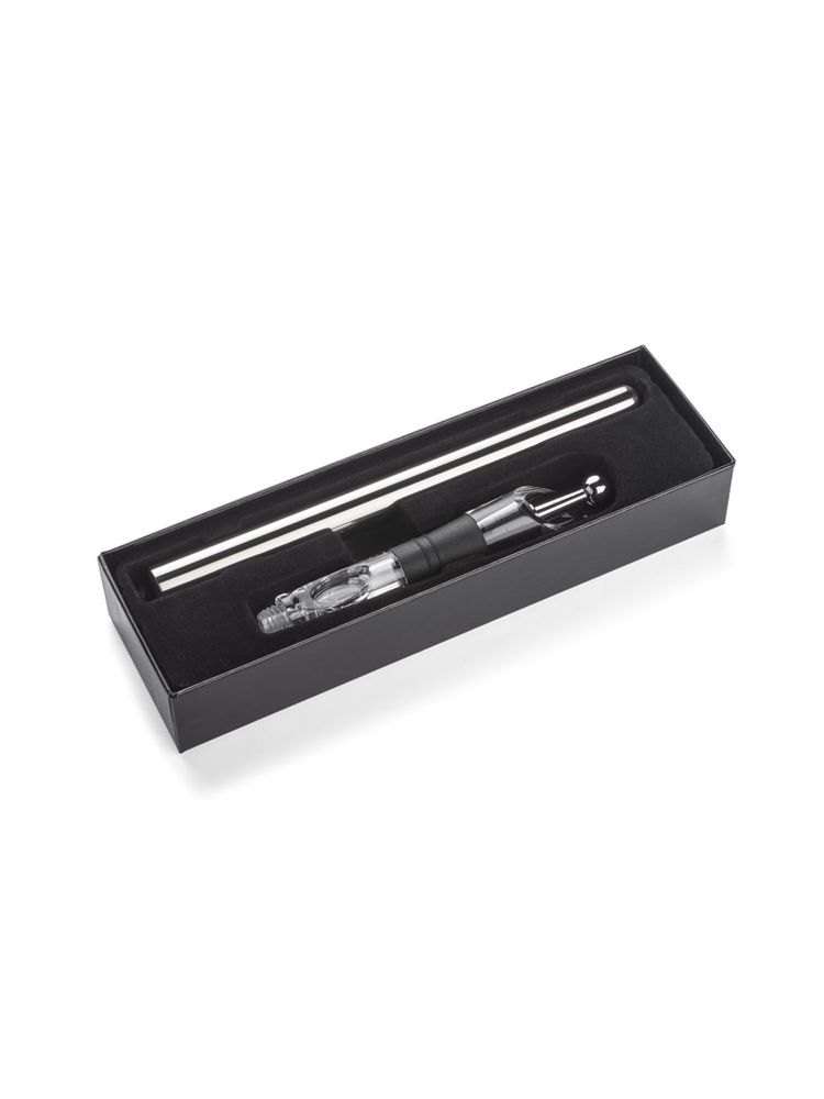 Prawdziwa gratka dla miłośników wina. Produkt skrywa wiele funkcji: utrzymuje odpowiednią temperaturę wina dzięki specjalnemu wkładowi chłodzącemu, napowietrza wino uwalniając jego aromaty dzięki ukrytemu w nalewaku aeratorowi, umożliwia zachowanie wszystkich aromatów w butelce poprzez zamykany korek. Odkręcany wkład chłodzący należy przed użyciem umieścić w zamrażalniku. Wszystkie elementy zapakowane w eleganckie czarne pudełko.
