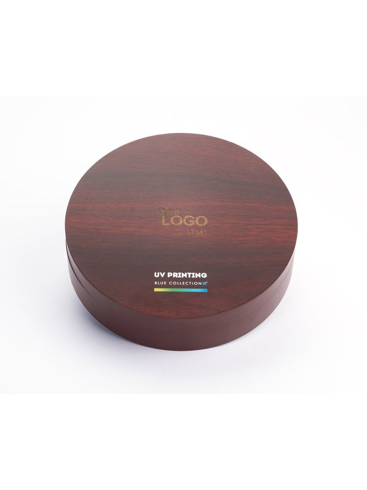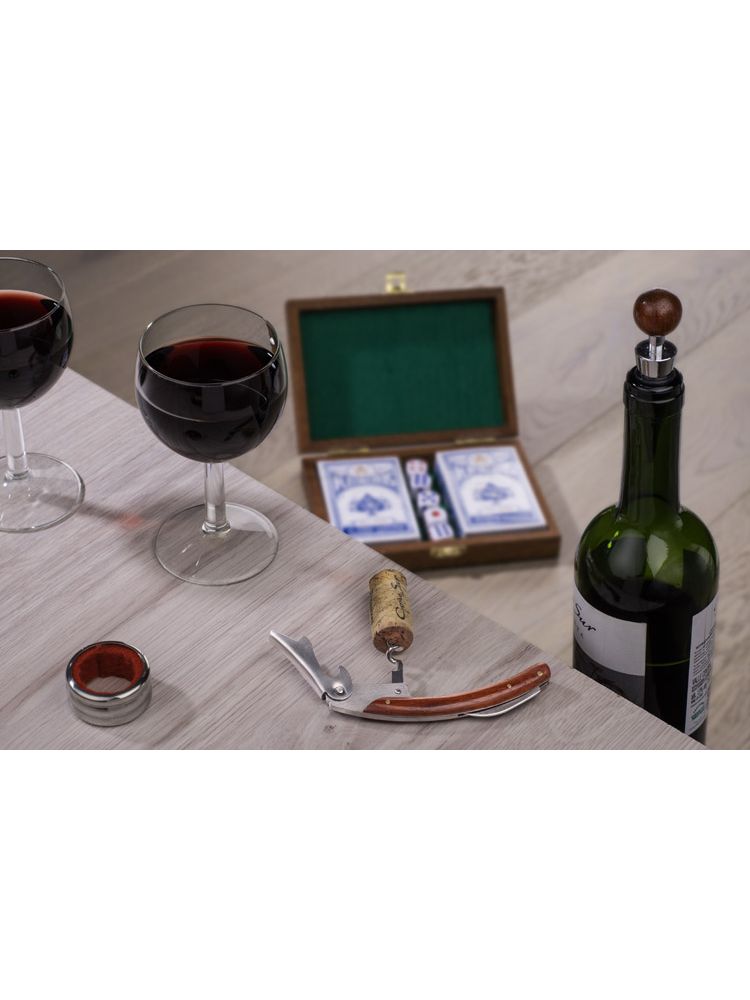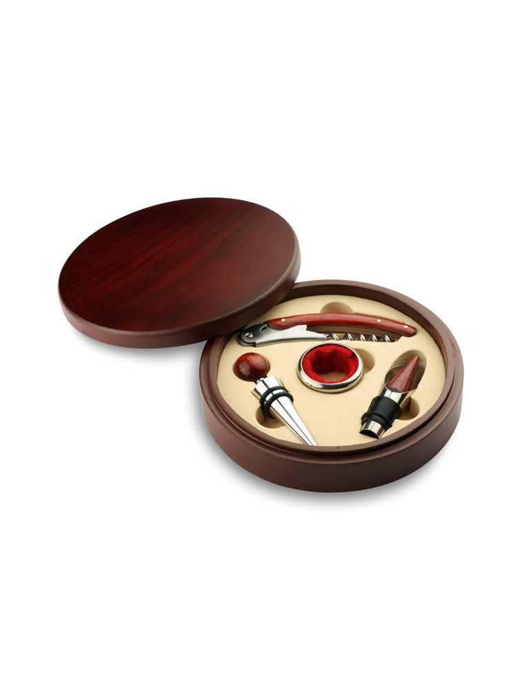 Praktyczny czteroelementowy komplet do wina w okrągłej drewnianej skrzyneczce. Zestaw zawiera nóż kelnerski, dwie zatyczki ozdobione korkiem oraz opaskę na butelkę. Logo grawerujemy bezpośrednio na pudełku.