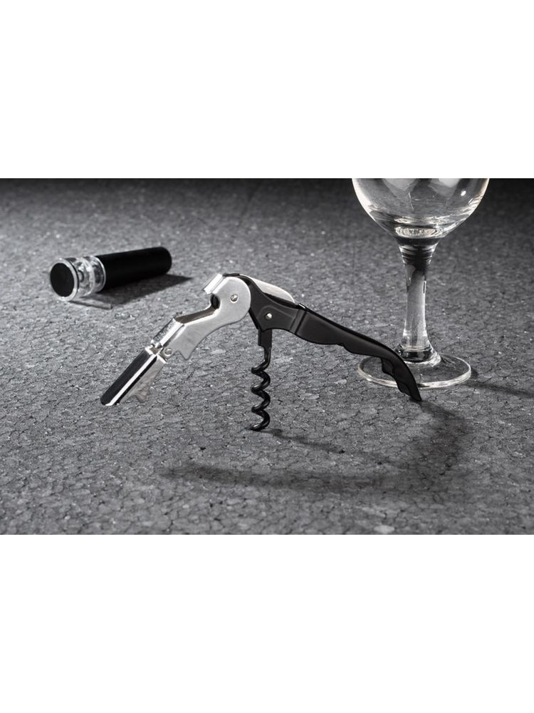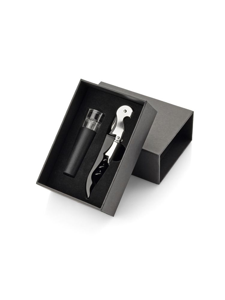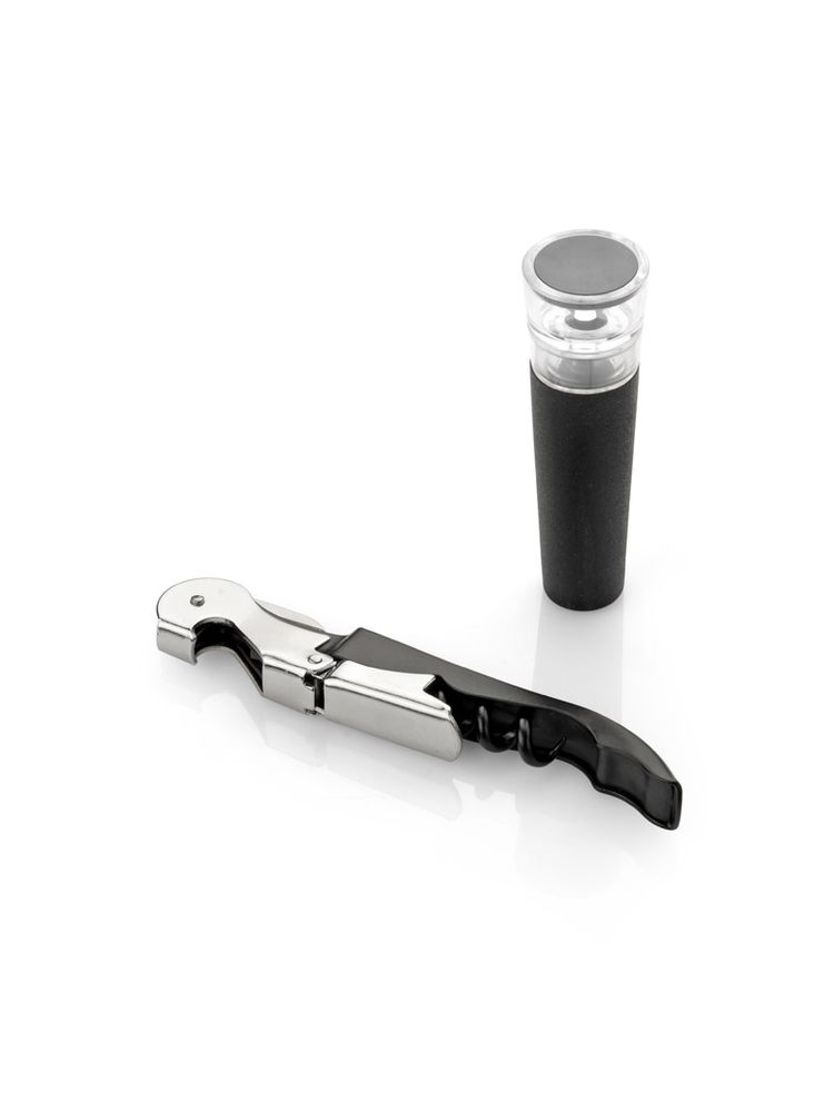Dwuelementowy, elegancki zestaw do wina zawiera próżniowy korek oraz korkociąg. Próżniowy korek z pompką zasysającą powietrze z butelki pozwala na dłuższe przechowywanie otwartego wina bez utraty cennych aromatów. Zestaw jest zapakowany w eleganckie czarne pudełko.