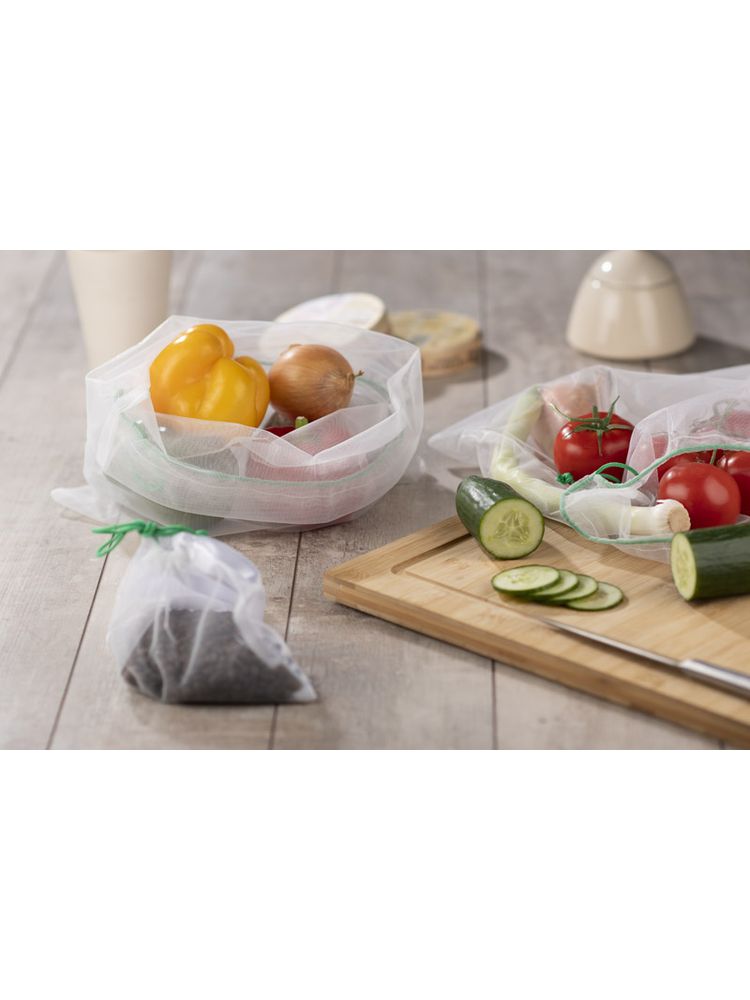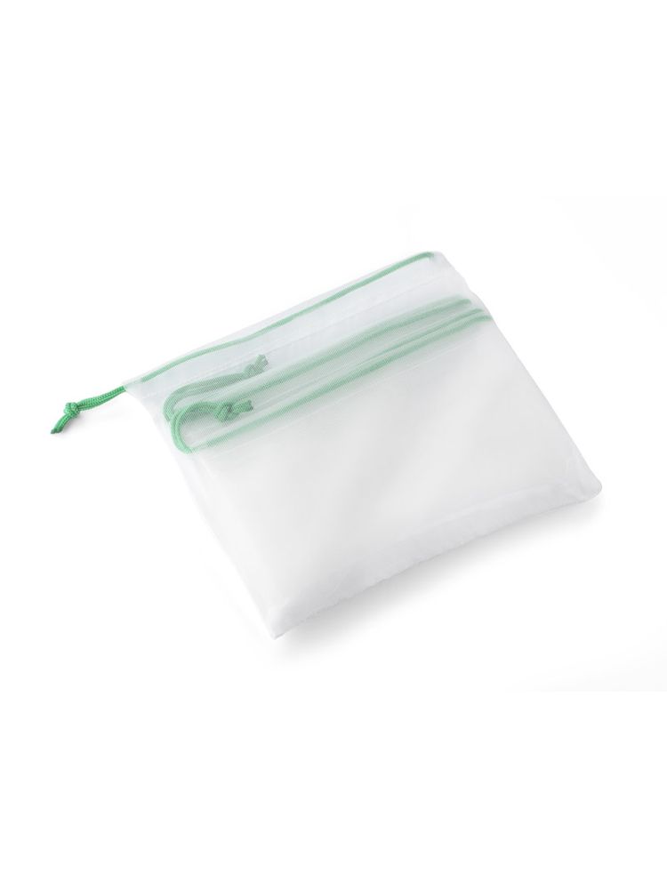 Zestaw worków stanowiący zakupowy niezbędnik w dzisiejszych czasach. Wykonany w idei “less waste” z recyklingowanego poliestru. Zestaw składa się z 2 większych worków w rozmiarze 320 × 340 mm oraz jednego mniejszego w rozmiarze 175 × 150 mm, będącego również etui. Mały woreczek z jednej strony jest wykonany z gładkiego poliestru.
