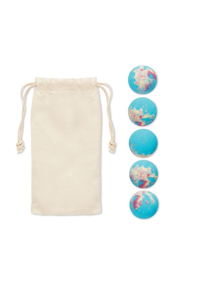 5 musujących kul do kąpieli w bawełnianym etui. Wielkość kulki Ø4 cm, o zapachu oceanu.