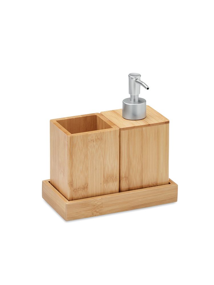 3-częściowy zestaw akcesoriów łazienkowych z bambusa. Zawiera pojemnik z pompką na mydło, kubek i podstawkę. Bambus jest produktem naturalnym, dlatego mogą wystąpić nieznaczne różnice w kolorze, wzorze i rozmiarze.