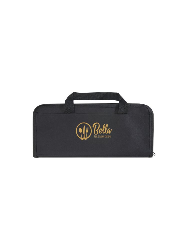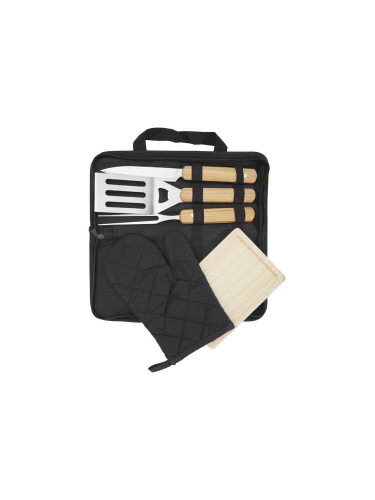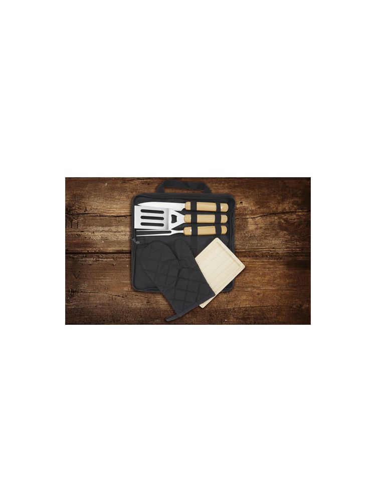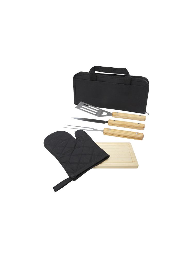 5-częściowy zestaw do grillowania z łopatką (29 × 7 cm), widelcem (29 × 1,7 cm), nożem (29 × 2,4 cm), deską do krojenia (19 × 13 × 1,1 cm) i rękawicą (25 × 16 cm).