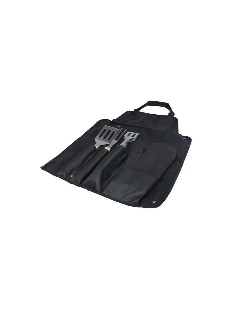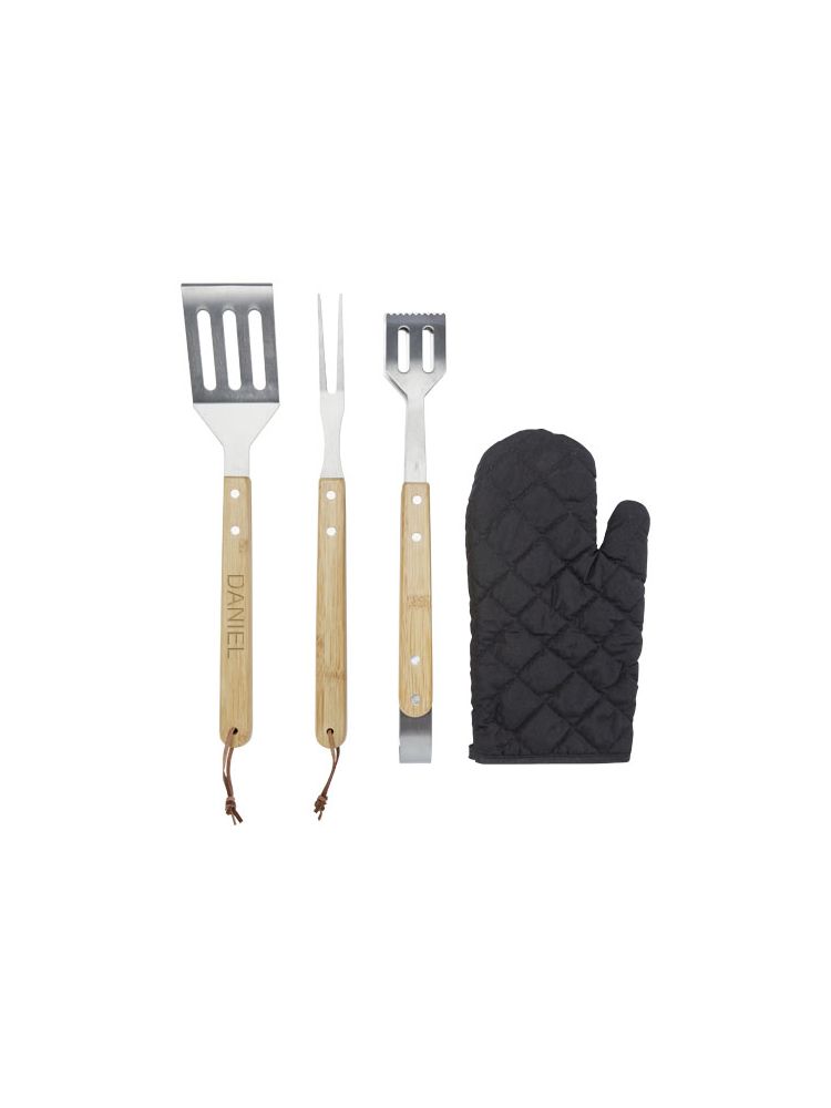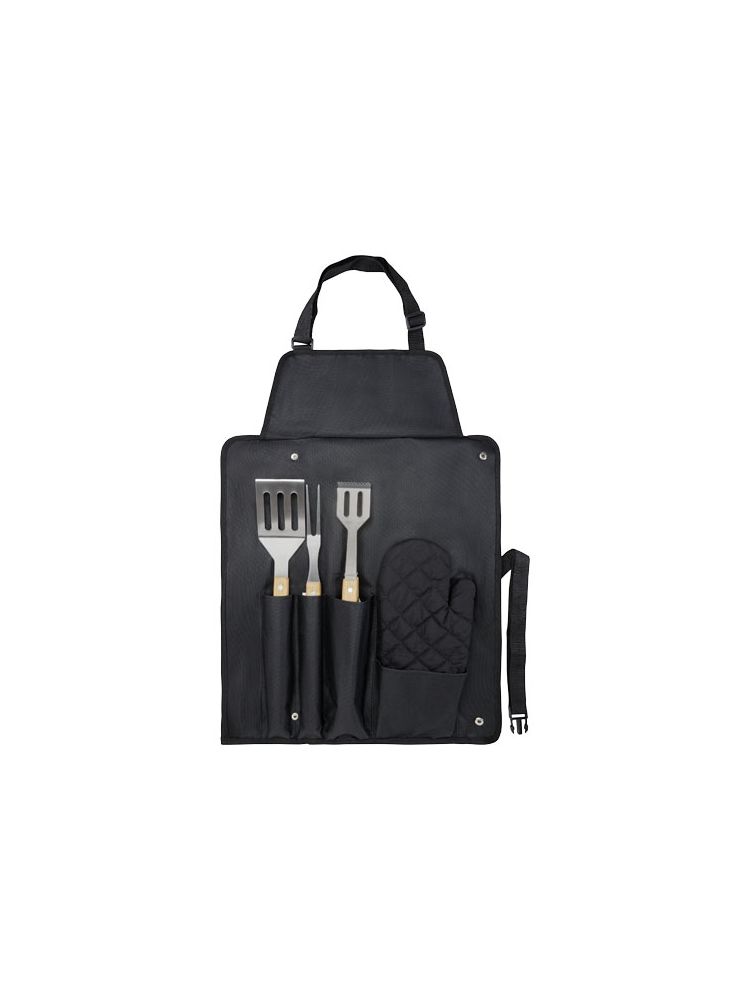 5-częściowy zestaw do grillowania z łopatką (36,5 × 7 cm), widelcem (36,5 × 2 cm), szczypcami (36,5 × 5 cm), rękawiczką (25 × 16 cm) i fartuchem z futerałem (42 × 60 cm). Uchwyty wykonane są z bambusa, który jest pozyskiwany i produkowany zgodnie z zasadami zrównoważonego rozwoju.