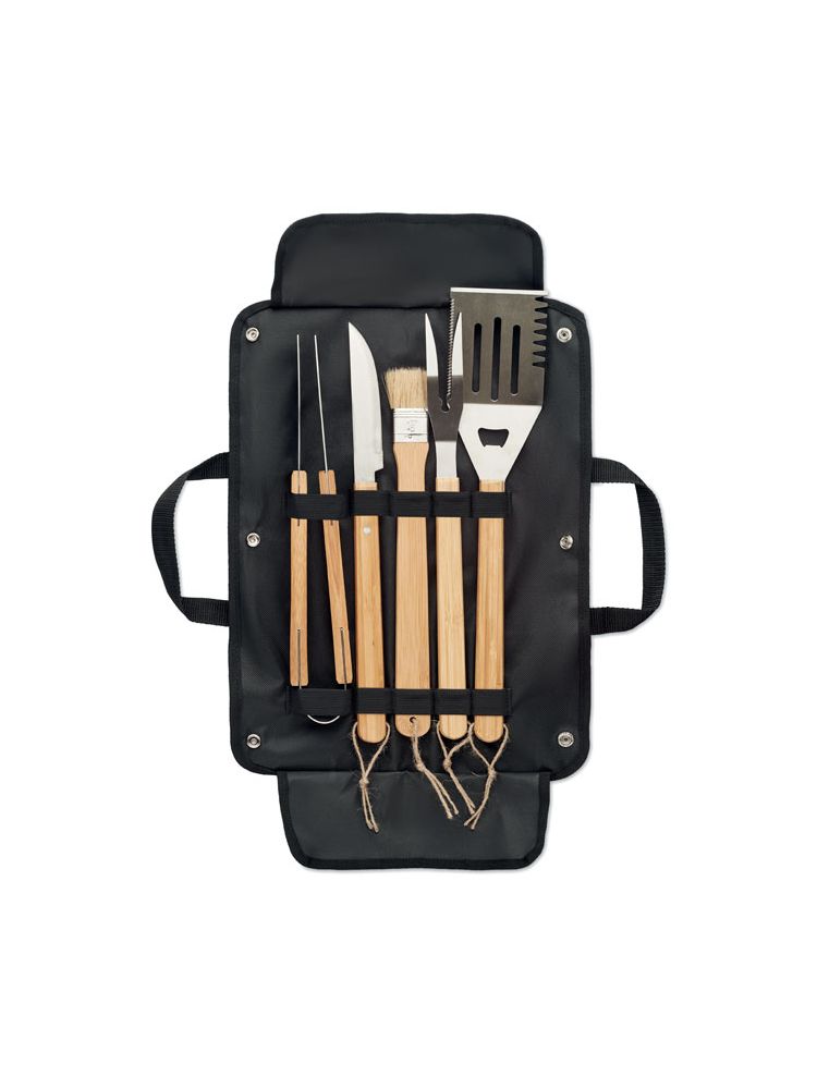 5-częściowy zestaw narzędzi do grillowania ze stali nierdzewnej z bambusowym uchwytem i woskowaną płócienną torbą. Zawiera szpatułkę, nóż, szczypce, widelec i pędzel.