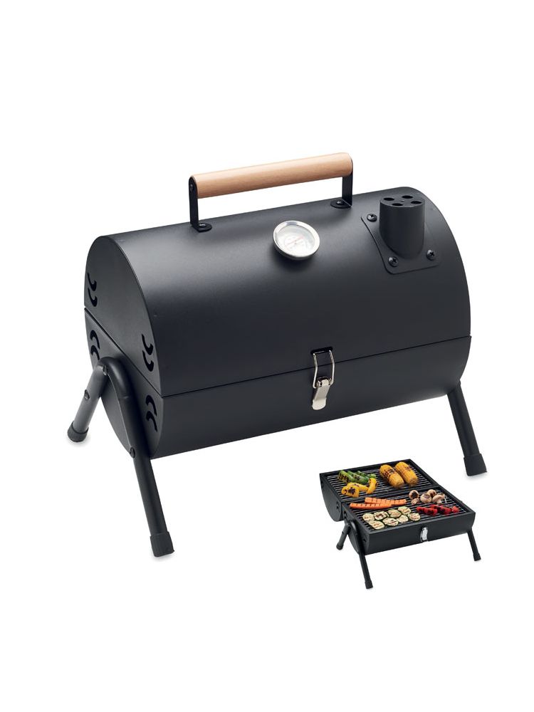 Przenośny grill żeliwny z kominem i wskaźnikiem temperatury. Palenisko malowane proszkowo na czarno. Zatrzask blokujący i drewniany uchwyt do przenoszenia.