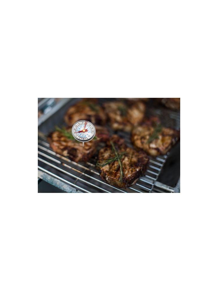 Termometr do grillowania z zakresami pomiarowymi zarówno w ℃, jak i ℉. Indukcję mechaniczną można bezpośrednio i dokładnie zmierzyć na patelni z olejem, podczas smażenia lub do kontroli temperatury na grillu. Wytrzymała obudowa ze stali nierdzewnej zapewnia wytrzymałość i odporność na korozję. Łatwy w użyciu i czyszczeniu.