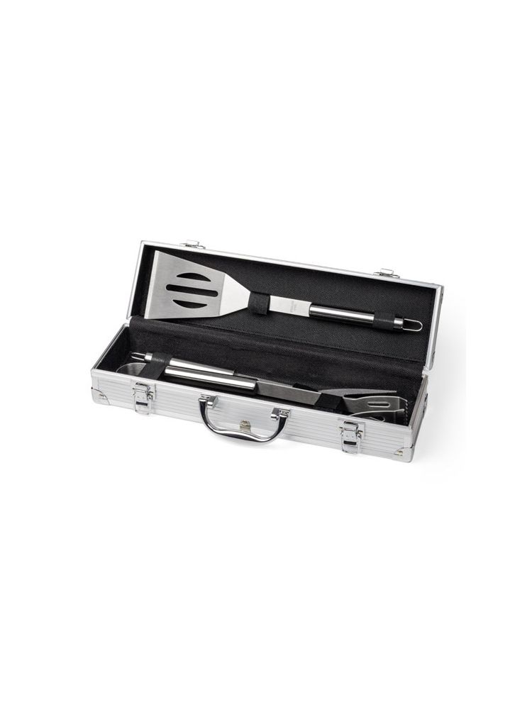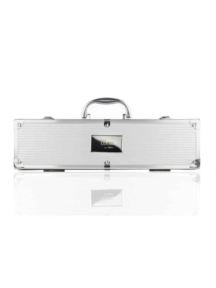 Praktyczny zestaw do grillowania zawierający tylko najbardziej niezbędne przyrządy: łopatkę, szpikulec, szczypce. Pakowany w wygodną walizeczkę. Logo wygrawerujemy na blaszce umieszczonej na walizeczce. Blaszka jest dołączona osobno.