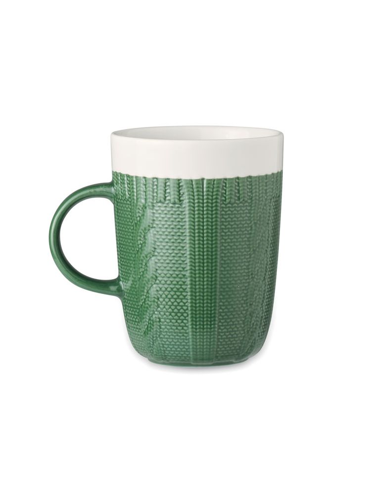 Kubek ceramiczny z motywem dzianiny. Pojemność: 310 ml. Pakowany w indywidualne pudełko.