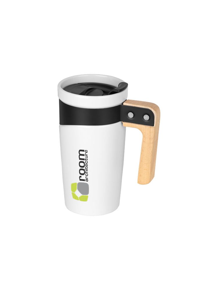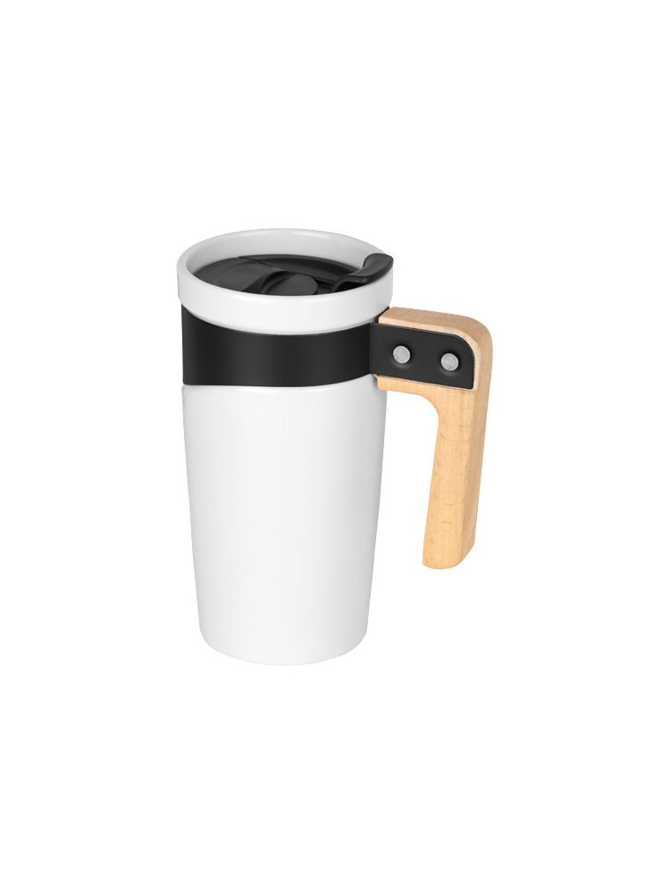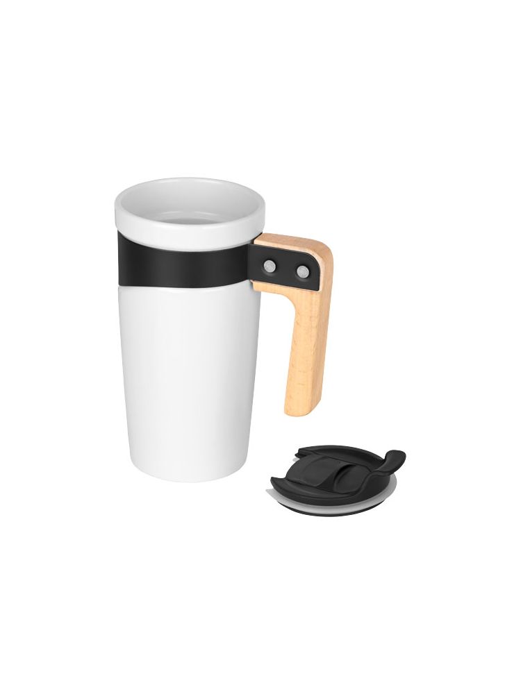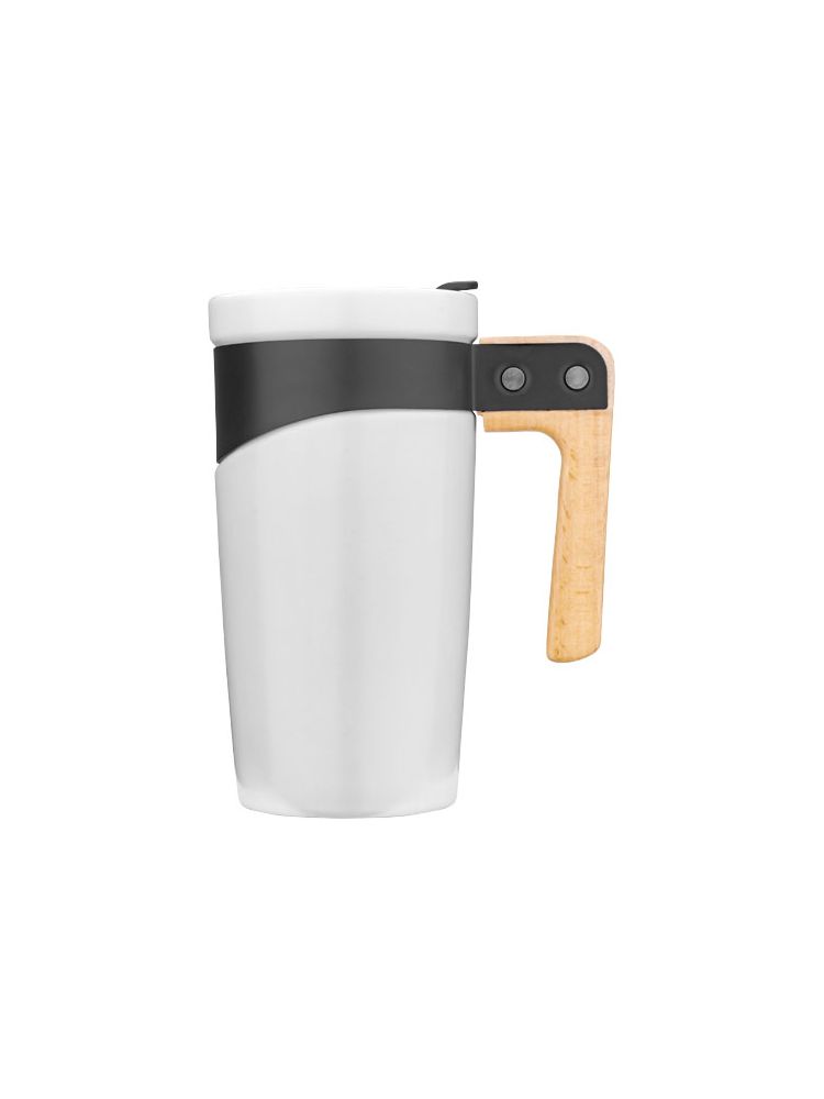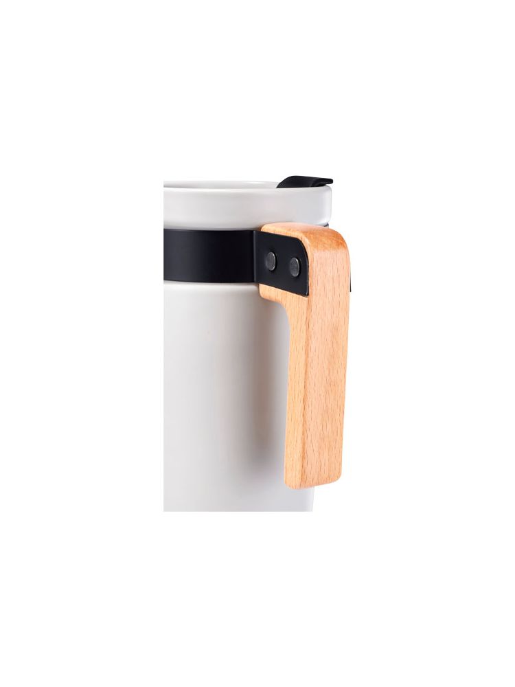 Kubek ceramiczny, który trzeba mieć. Matowy korpus, drewniana rączka wykończone czarną opaską ze stali nierdzewnej. Wieczko otwiera się przez przesunięcie. Pojemność 475ml. Zapakowany w pudełko upominkowe.