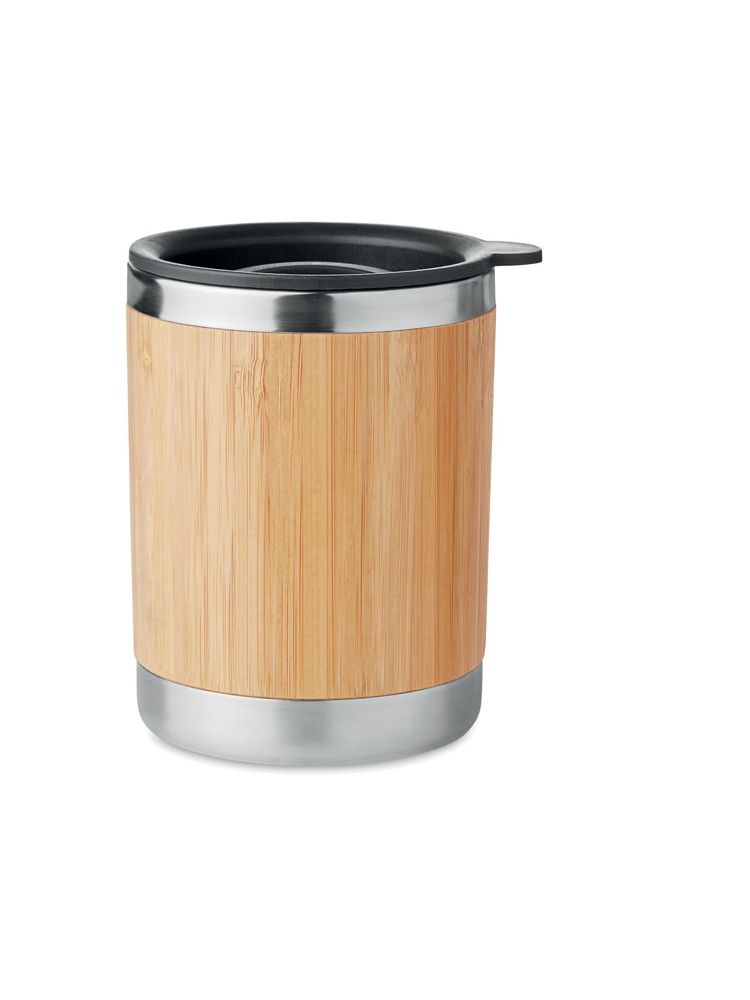 Kubek ze stali nierdzewnej z podwójnymi ściankami. Bambusowa obudowa. Pojemność 250 ml. Bambus jest produktem naturalnym, dlatego mogą występować niewielkie różnice w kolorze i rozmiarze poszczególnych elementów, co może mieć wpływ na ostateczny efekt zdobienia.