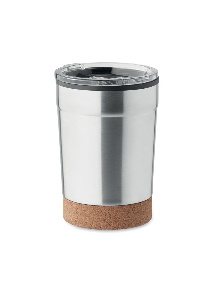 Zewnętrzna podwójna ścianka ze stali nierdzewnej i wewnętrzna strona z PP. Korkowa podstawka i przesuwane otwarcie do picia. Nie przecieka. Pojemność: 300 ml.