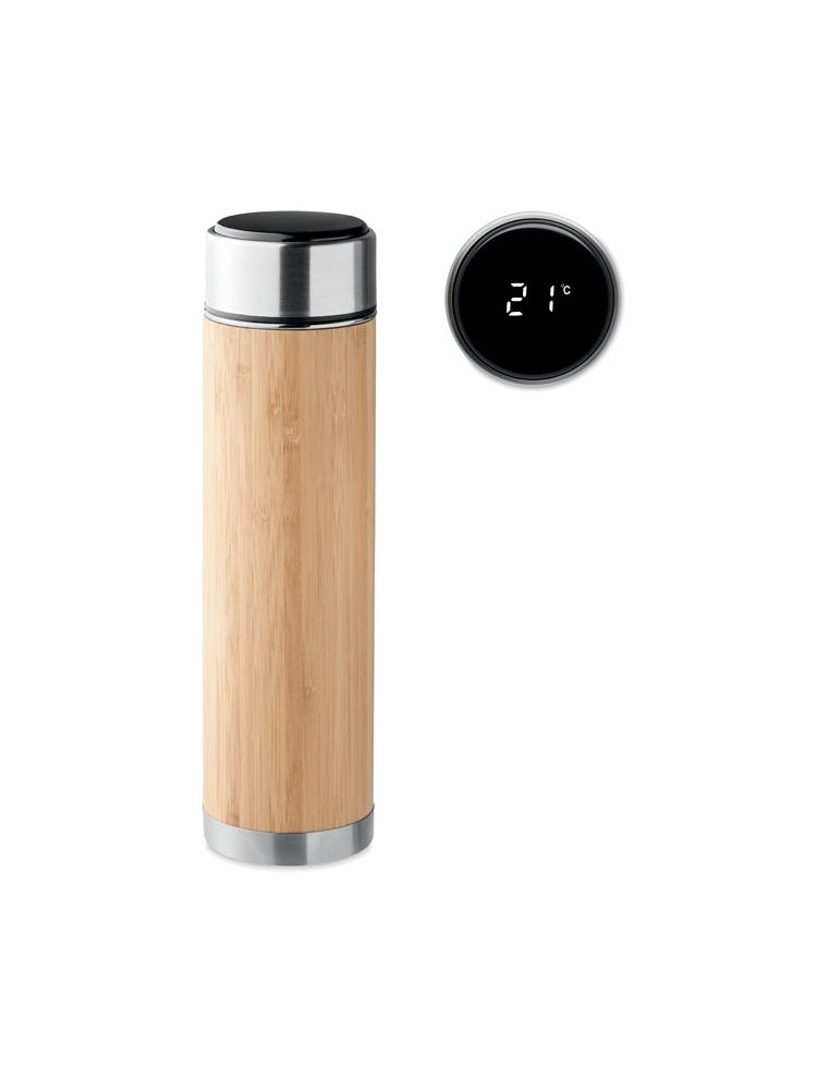 Termos z podwójnymi ściankami, wykonany ze stali nierdzewnej i bambusa, z filtrem do herbaty. Z wbudowanym termometrem dotykowym LED w pokrywie. Zawiera 1 wymienną baterię CR2032. Pojemność: 480 ml. Szczelny. Bambus jest produktem naturalnym, dlatego mogą wystąpić nieznaczne różnice w kolorze, wzorze i rozmiarze.