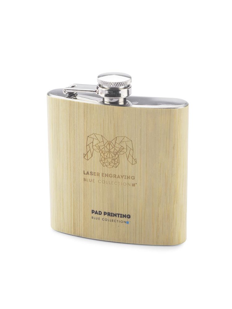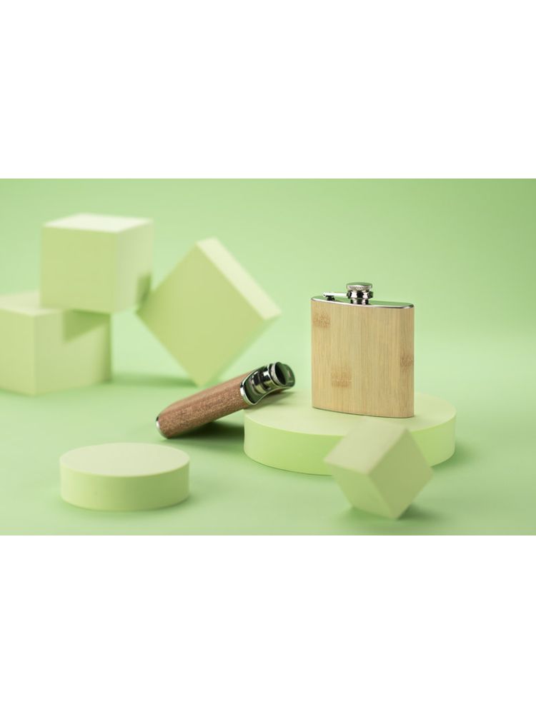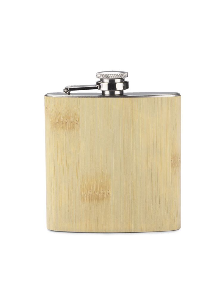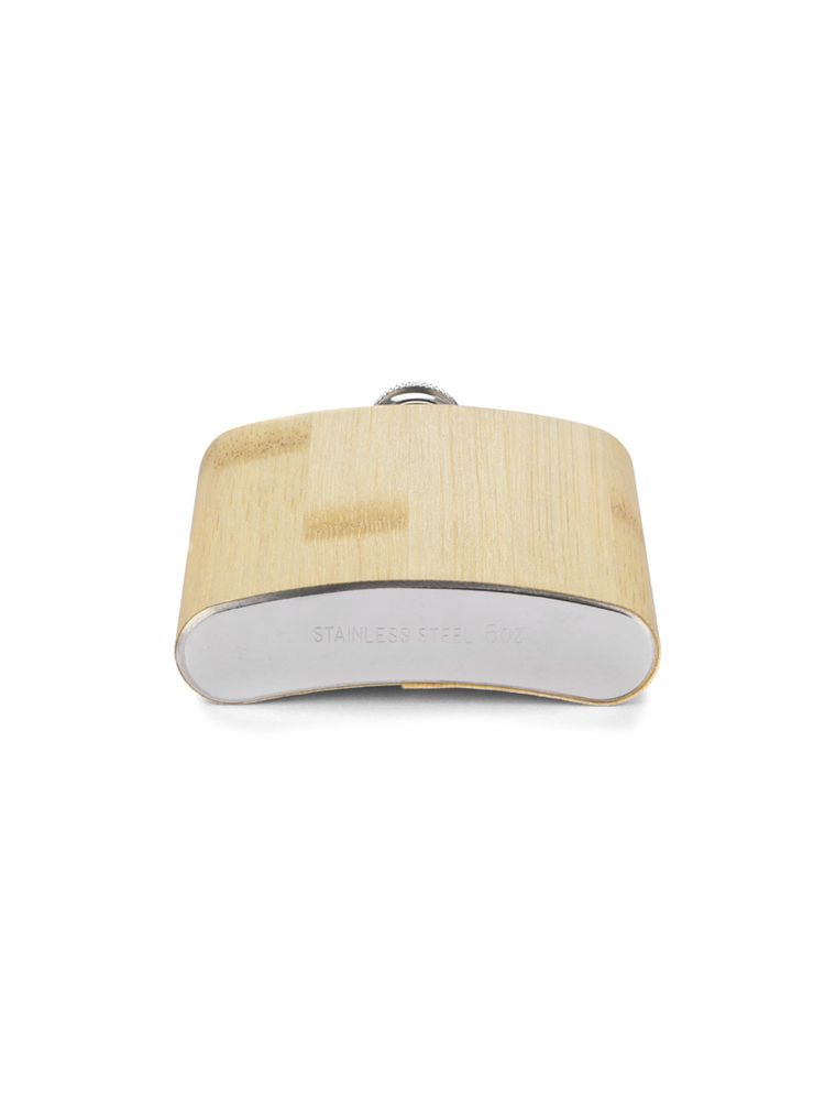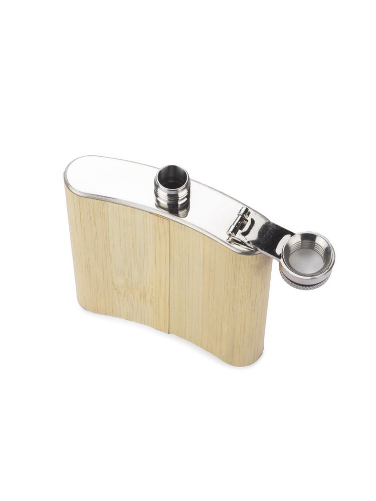 Piersiówka ze stali nierdzewnej o pojemności 200 ml z bezpiecznym zamknięciem. Wykończona jest bardzo cienką warstwą naturalnego bambusa.