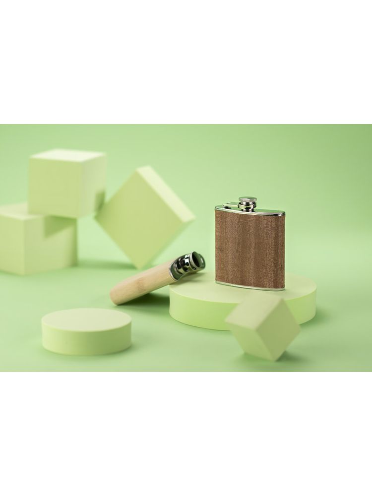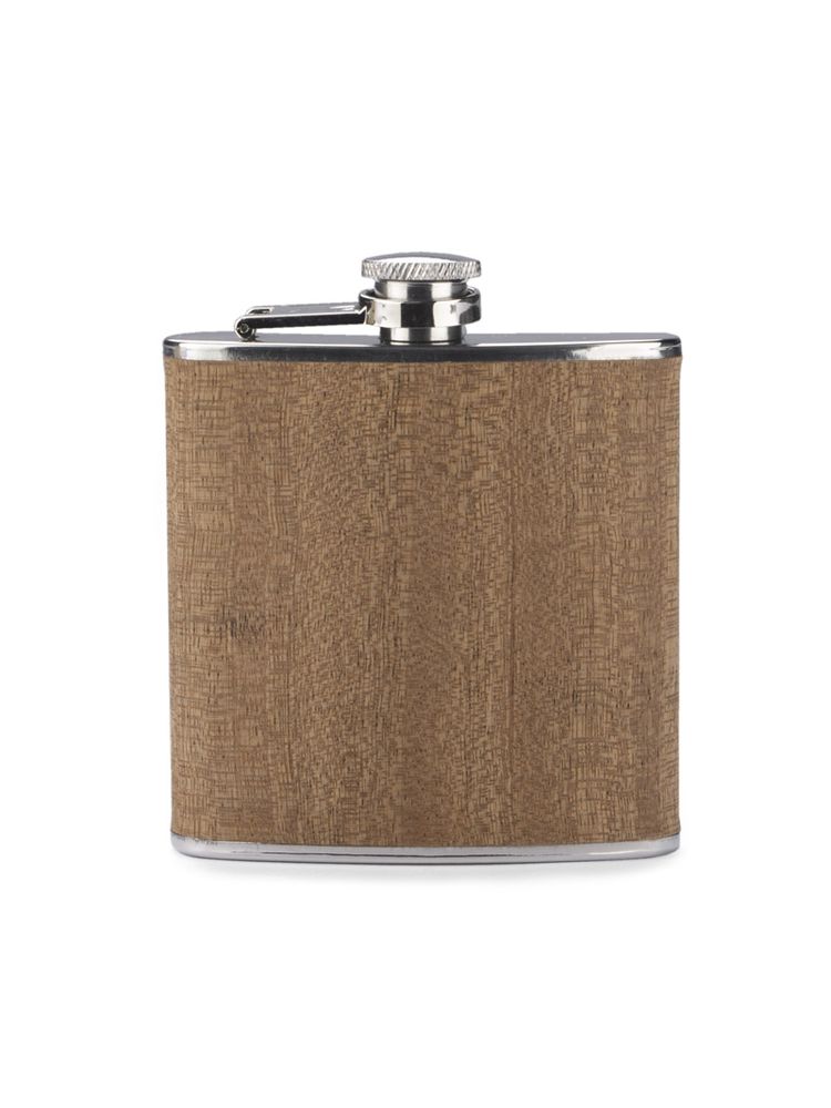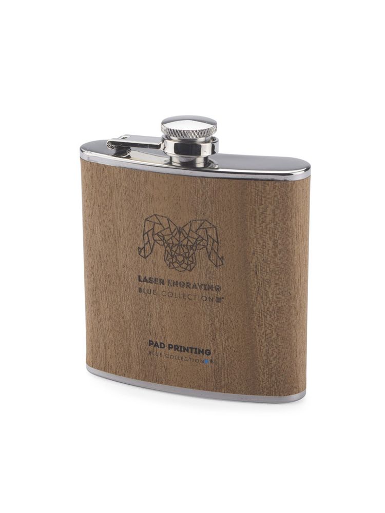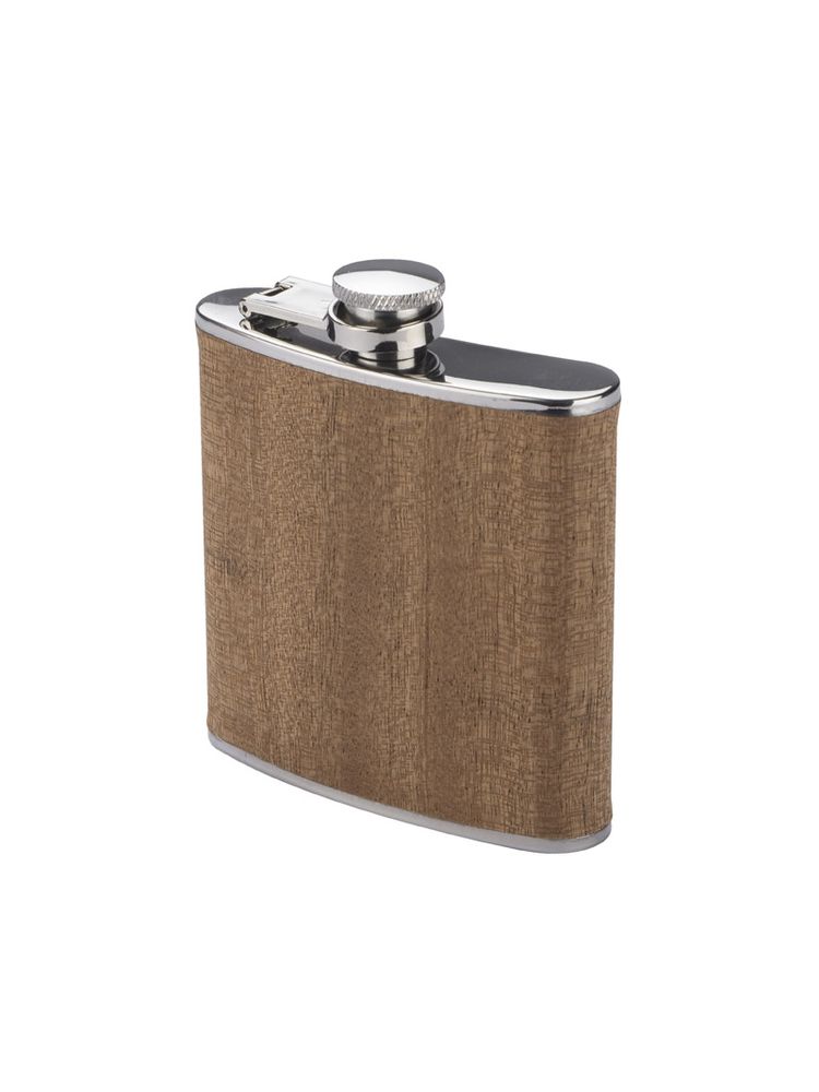 Piersiówka ze stali nierdzewnej o pojemności 200 ml z bezpiecznym zamknięciem. Wykończona jest bardzo cienką warstwą naturalnego drewna.