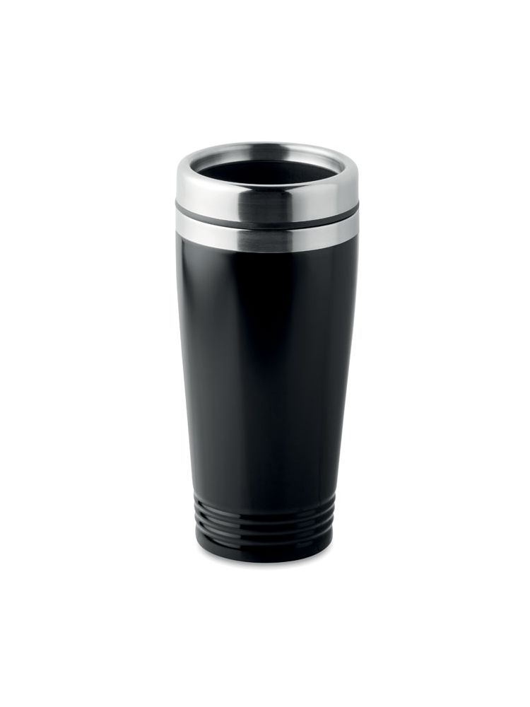 Kubek podróżny ze stali nierdzewnej z podwójnymi ściankami, z czarną pokrywką z PP. Pojemność: 400 ml.