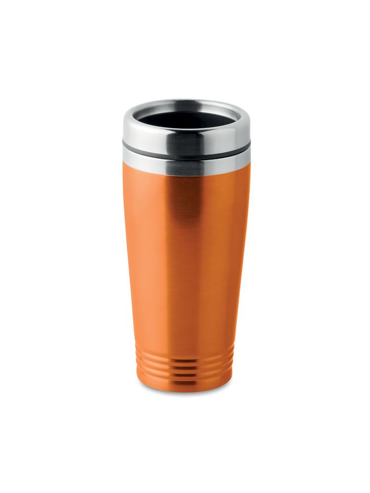 Kubek podróżny ze stali nierdzewnej z podwójnymi ściankami, z czarną pokrywką z PP. Pojemność: 400 ml.