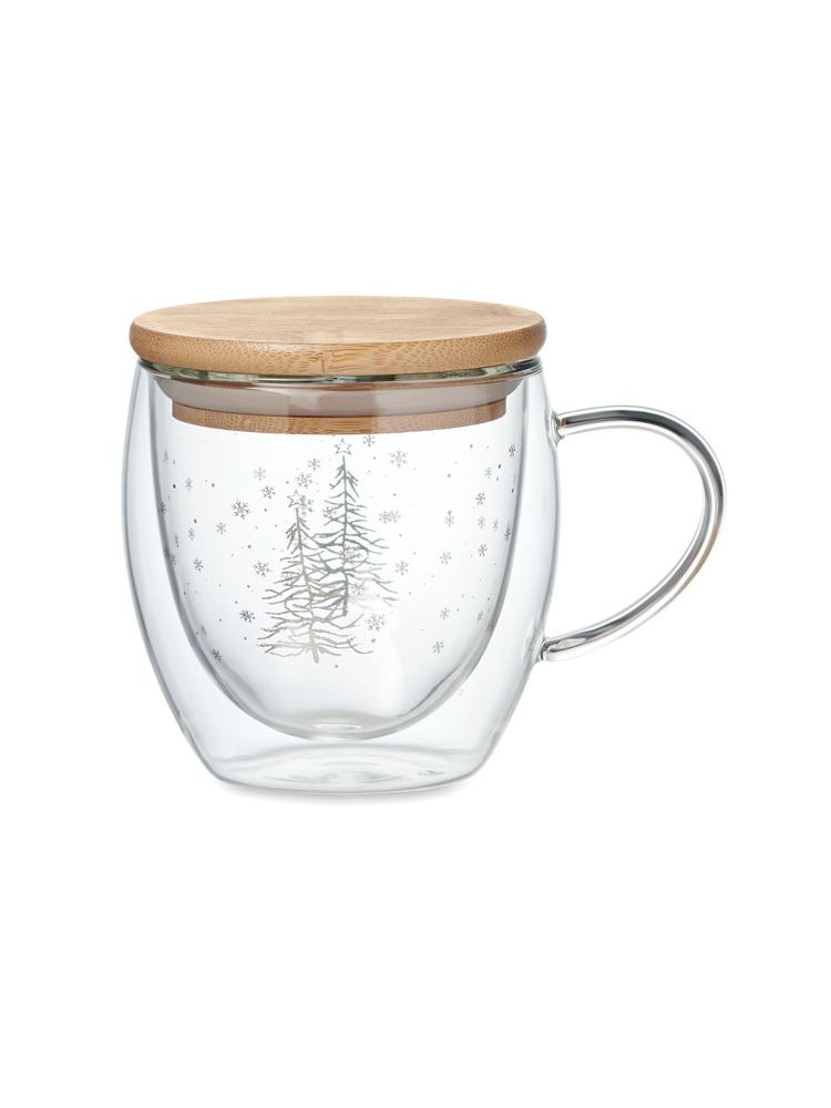 Szklany kubek borokrzemianowy o podwójnych ściankach, z motywem drzewa i bambusową pokrywką. Pojemność: 220 ml. Bambus jest produktem naturalnym, dlatego mogą wystąpić nieznaczne różnice w kolorze, wzorze i rozmiarze.