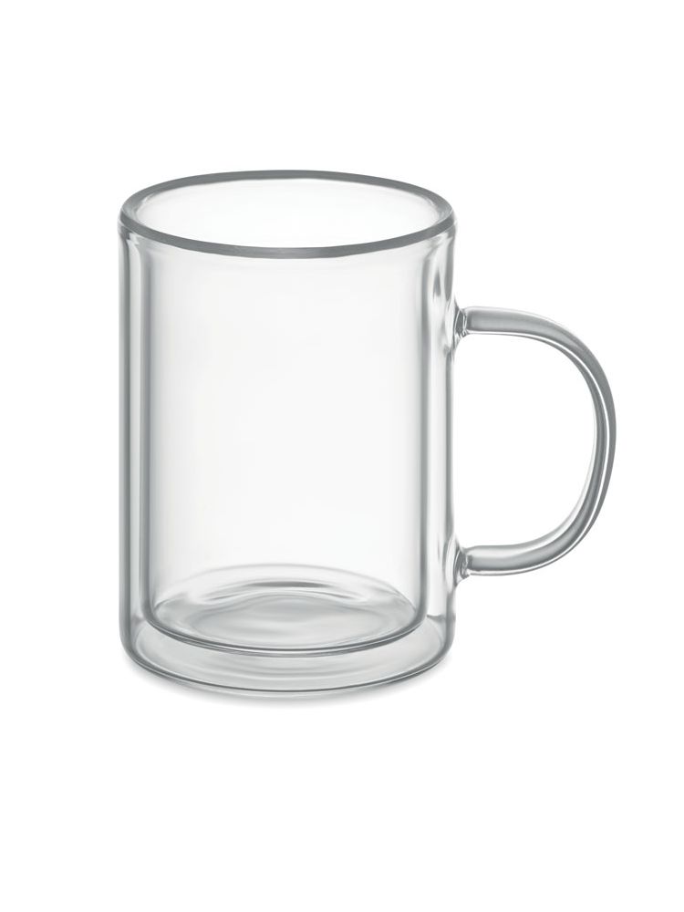Szklany kubek, szklanka o podwójnych ściankach i pojemności 225 ml, ze specjalną powłoką do sublimacji.