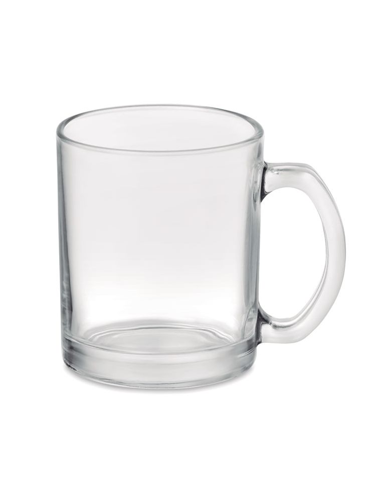 Błyszczący szklany kubek o pojemności 300 ml ze specjalną powłoką do sublimacji.