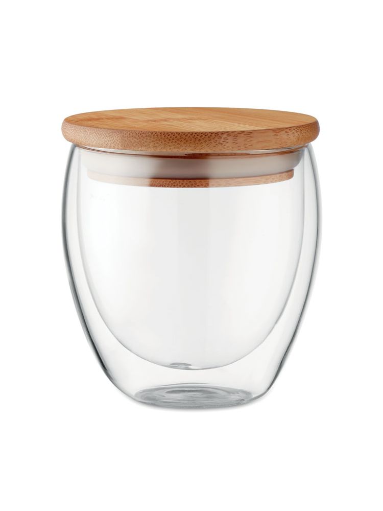 Szklanka z dwuwarstwowego szkła borokrzemianowego z pokrywką bambusową z silikonową uszczelką. Pojemność 250 ml.Bambus jest produktem naturalnym, dlatego mogą wystąpić nieznaczne różnice w kolorze, wzorze i rozmiarze.