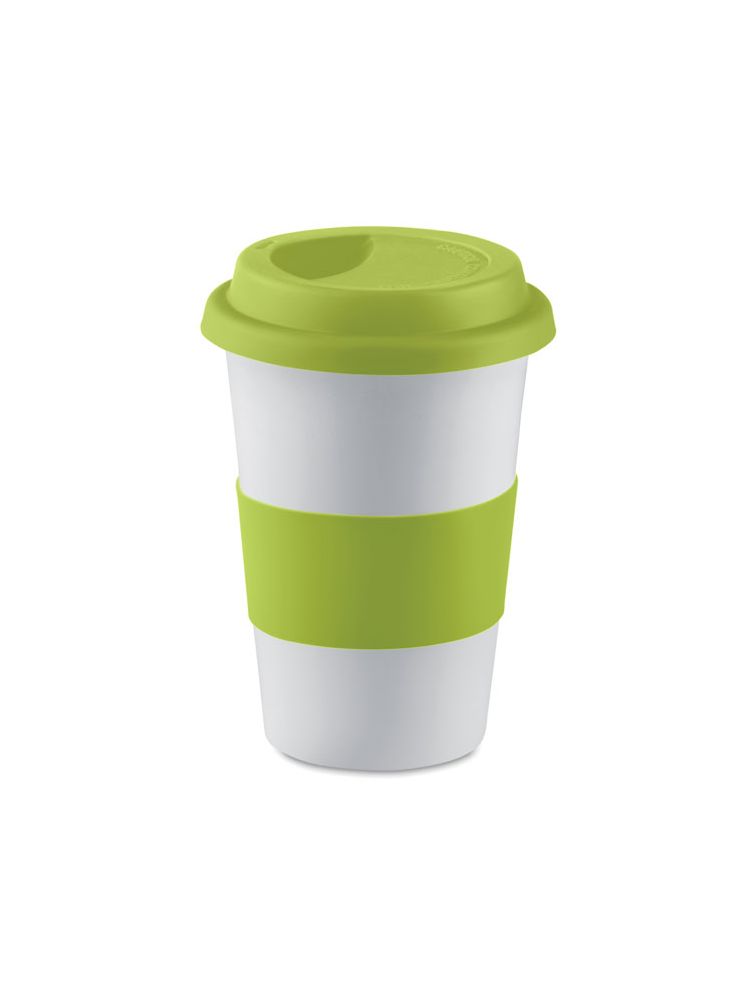 Pojedynczy ceramiczny kubek z silikonową nakładką i panelem do chwytania. Pojemność 400ml. Transfer ceramiczny jest odporny na zmywanie w zmywarkach. Jako że jest to jednowarstwowy kubek, nagrzewa się też zewnętrzna strona.