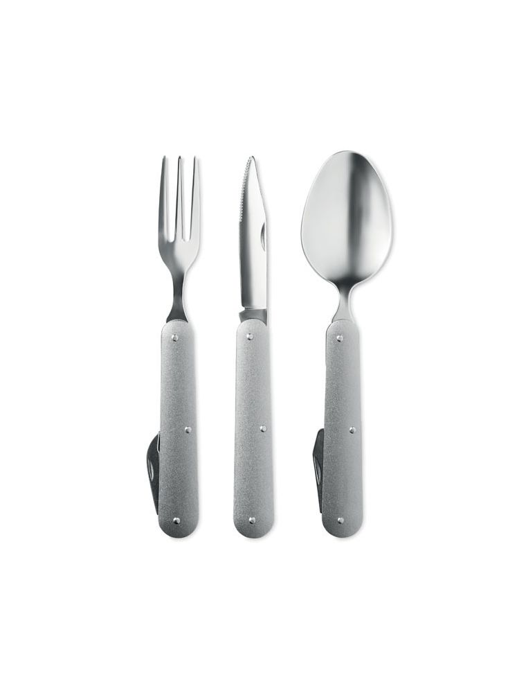 Komplet sztućców kempingowych ze stali nierdzewnej z aluminiowym uchwytem. Łyżka, widelec i nóż zapakowane w białe kartonowe pudełko.