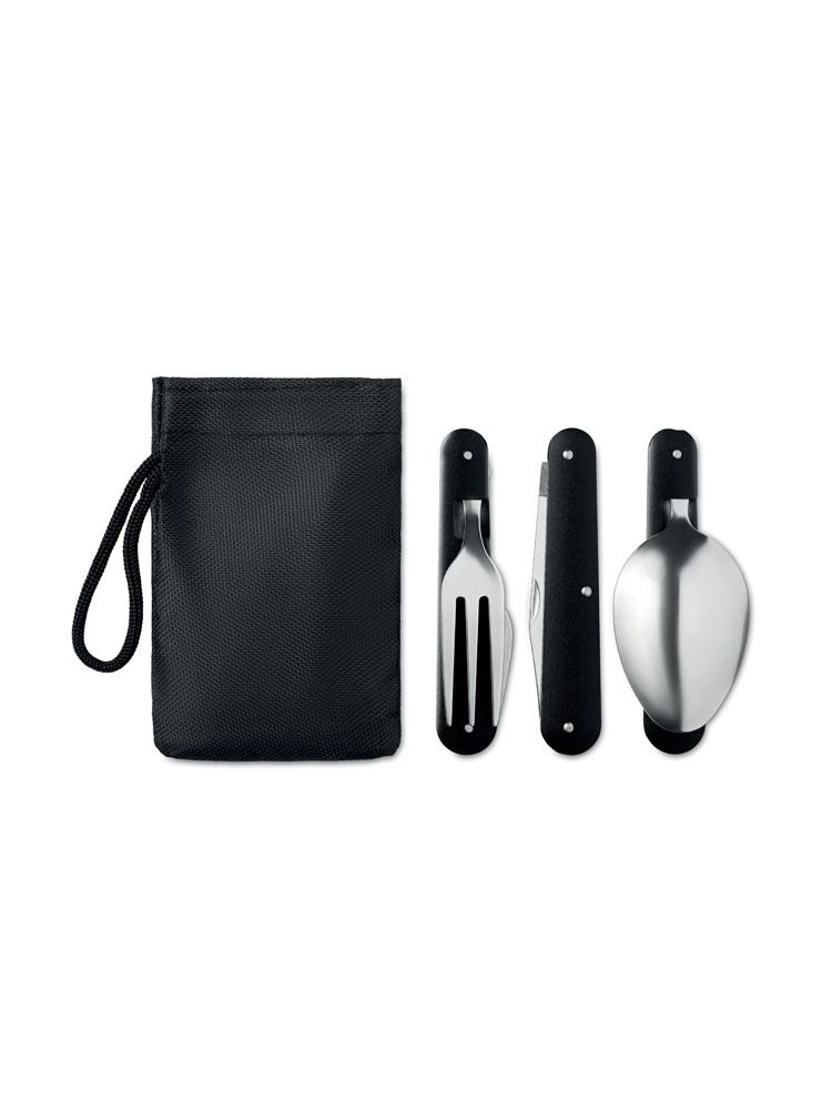 Komplet sztućców kempingowych ze stali nierdzewnej z aluminiowym uchwytem. Łyżka, widelec i nóż zapakowane w białe kartonowe pudełko.