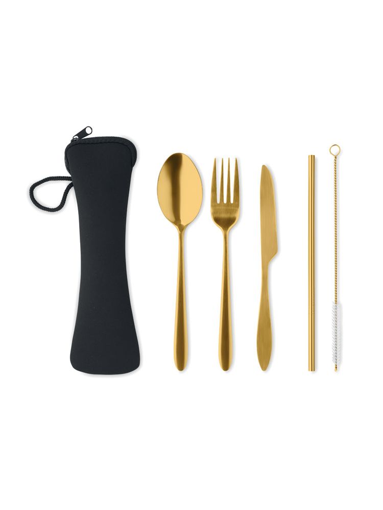 Zestaw sztućców ze stali nierdzewnej wielokrotnego użytku, w tym widelec, nóż, łyżka, słomka i szczotka w etui z neoprenu.