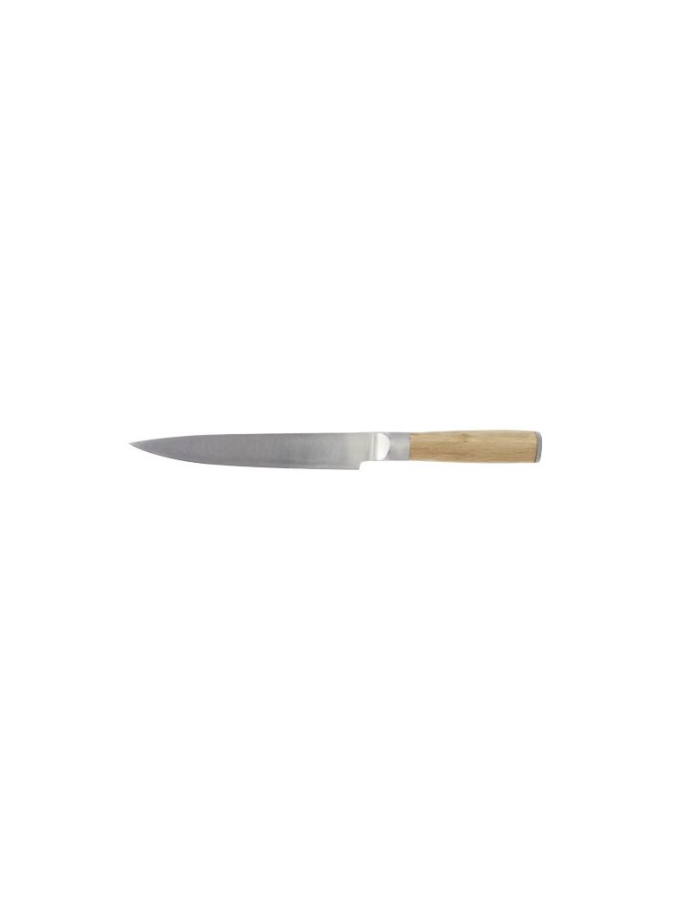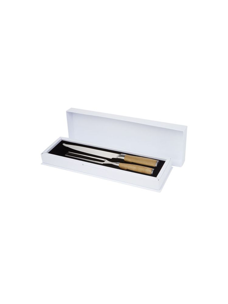 Nóż i widelec do krojenia z bambusowymi uchwytami. Rozmiar noża: 33,2 cm x 3,1 cm. Rozmiar widelca: 29,2 cm x 2,5 cm.