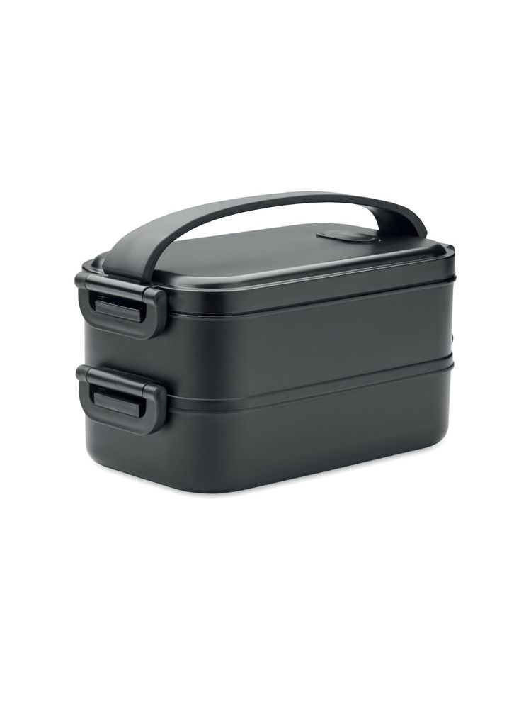 Dwupoziomowy pojemnik na lunch z PP z wyjmowaną przegrodą z bocznymi klamrami i hermetyczną pokrywką. Pojemność: 800 ml (2x).