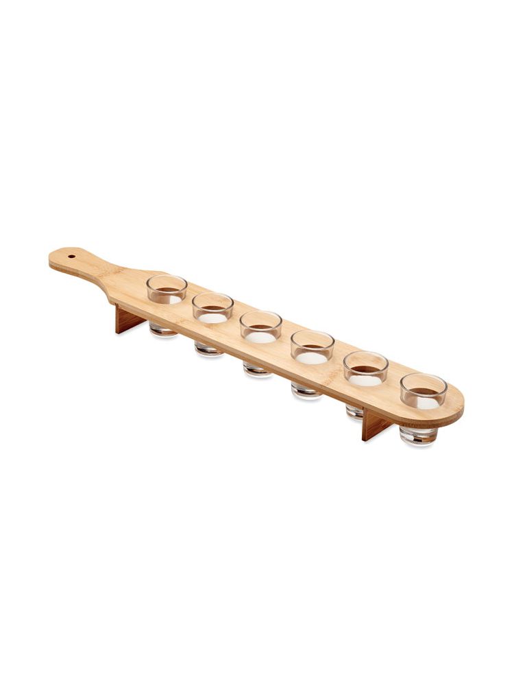 Zestaw 6 kieliszków do shotów na bambusowej tacce. Pojemność: 20 ml. Bambus jest produktem naturalnym, dlatego mogą wystąpić nieznaczne różnice w kolorze, wzorze i rozmiarze.