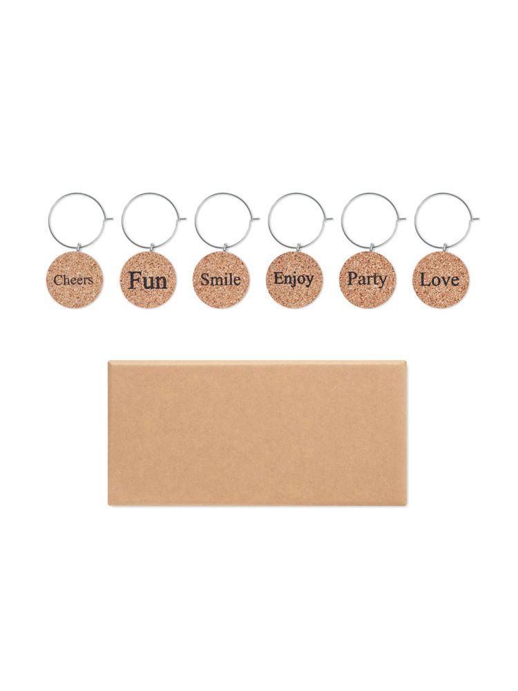Zestaw 6 znaczników korkowych do kieliszków, pakowane w pudełku. Znaczniki mają jednostronnie nadrukowany napis. Korek jest materiałem w 100% naturalnym. Ze względu na jego strukturę i porowatość powierzchni ostateczny wygląd nadruku na każdym artykule może się różnić.