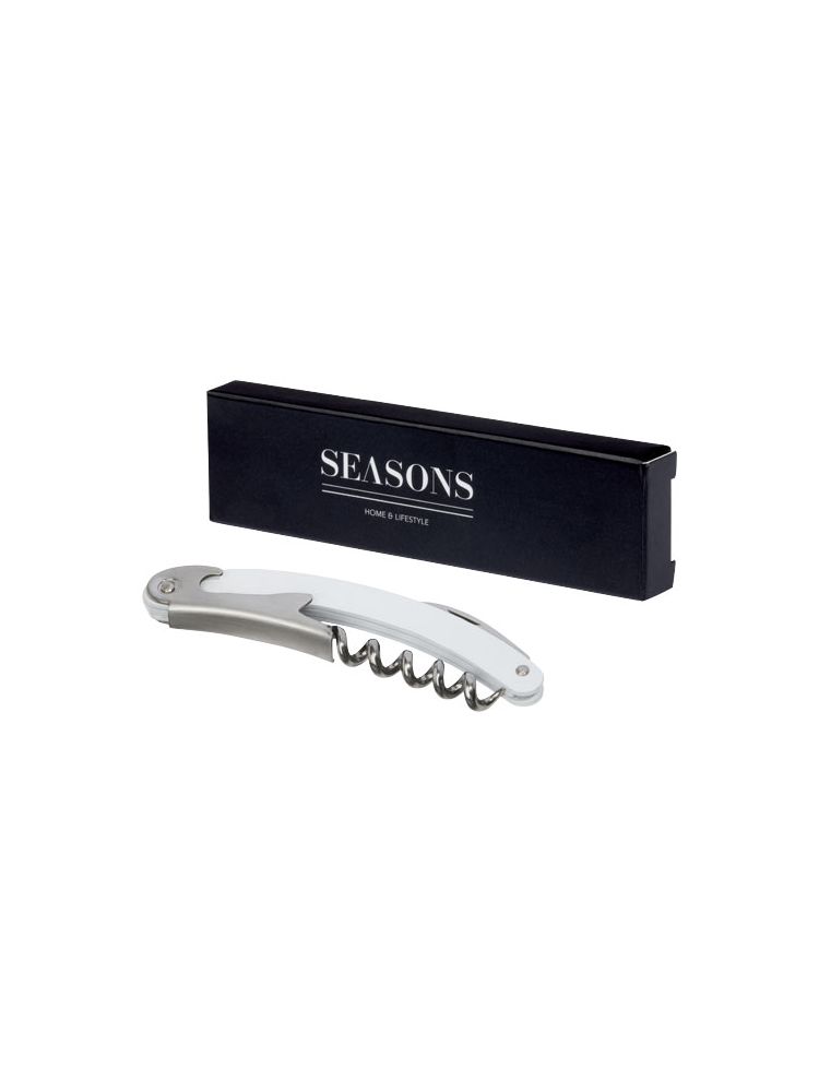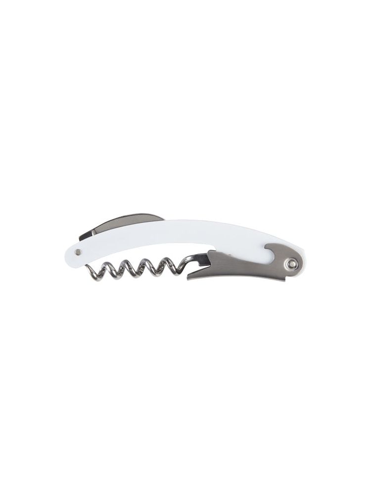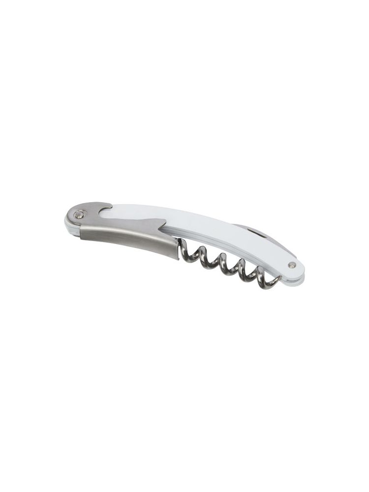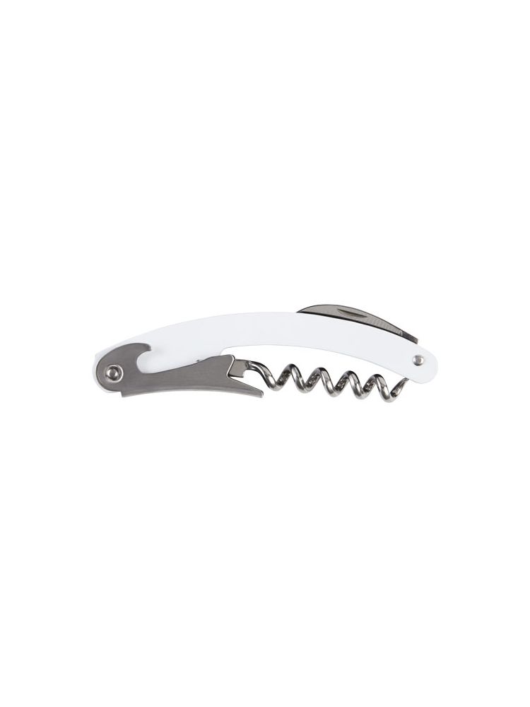 Nóż kelnerski ze stali nierdzewnej z kolorowym korpusem, wyposażony w przecinak do folii i otwieracz do butelek.