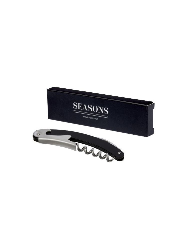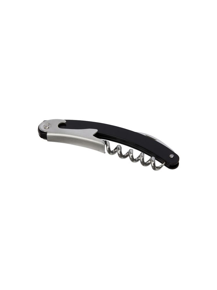Nóż kelnerski ze stali nierdzewnej z kolorowym korpusem, wyposażony w przecinak do folii i otwieracz do butelek.
