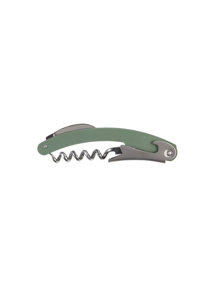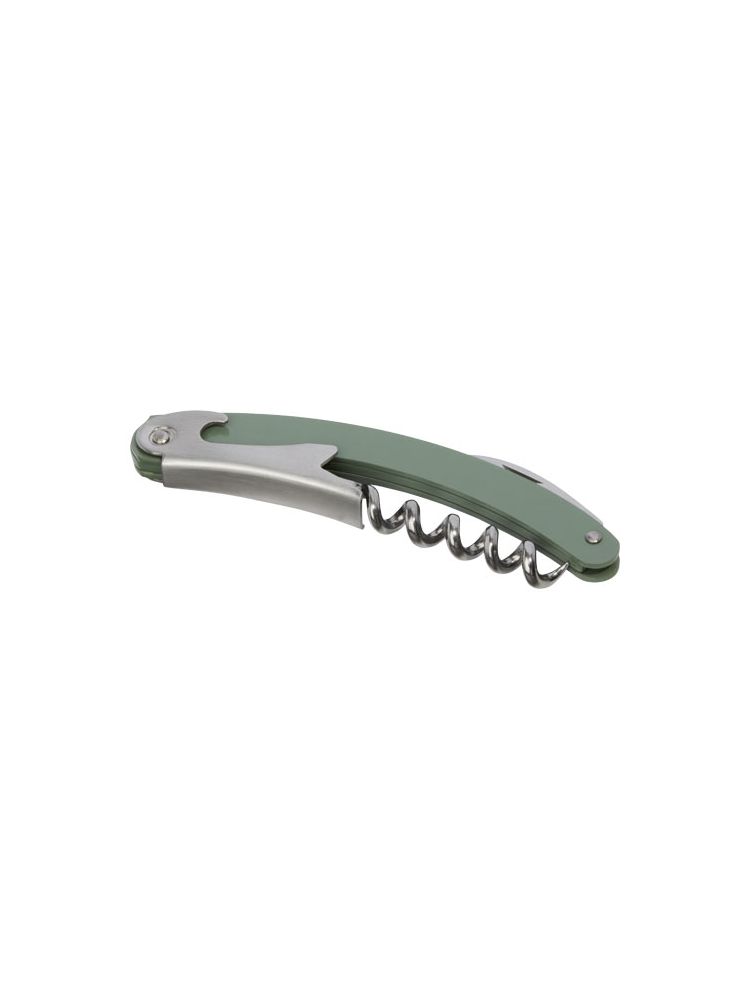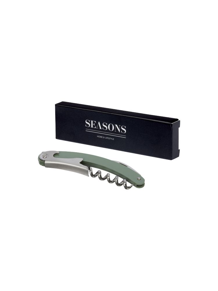 Nóż kelnerski ze stali nierdzewnej z kolorowym korpusem, wyposażony w przecinak do folii i otwieracz do butelek.
