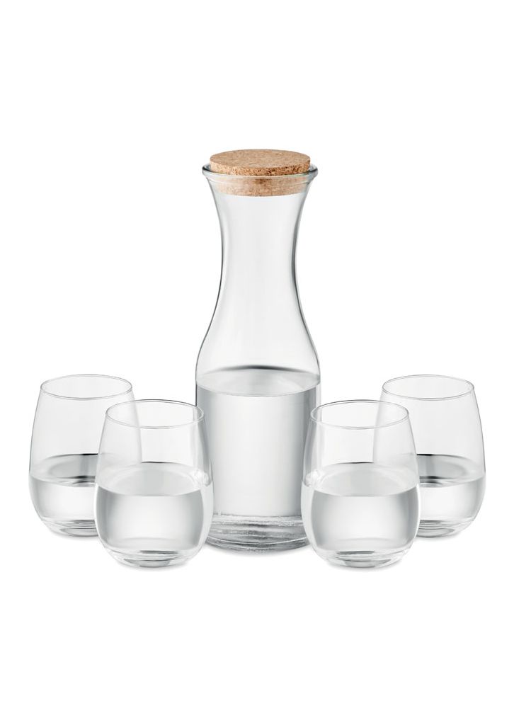 Zestaw do napojów wykonany ze szkła pochodzącego z recyklingu. W skład zestawu wchodzi: Karafka (1L) z korkową pokrywką i 4 szklanki (420 ml). Korek jest materiałem w 100% naturalnym. Ze względu na jego strukturę i porowatość powierzchni ostateczny wygląd nadruku na każdym artykule może się różnić.
