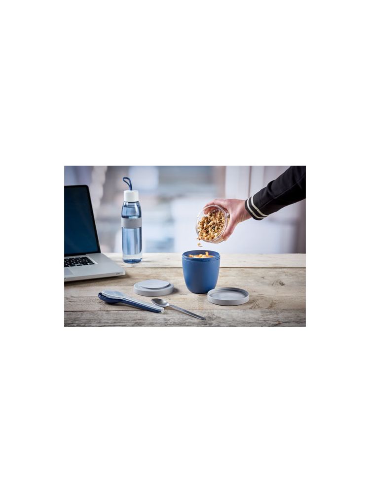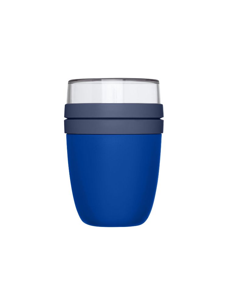 Pojemnik na lunch z dwiema komorami, aby oddzielenie przechowywać różne składniki. Oba pojemniki mają oddzielne pokrywy i dlatego pozostają czyste. Pojemność górnego przezroczystego pojemnika wynosi 200 ml, co oznacza, że może pomieścić około 75 gramów żywności w formie stałej. Pojemność dolnego pojemnika wynosi 500 ml. Wykonane z trwałego materiału, dzięki czemu mogą być przechowywane w zamrażarce oraz stosowane w kuchence mikrofalowej (należy zdjąć pokrywę) i zmywarce. Górnego przezroczystego pojemnika nie należy używać w kuchence mikrofalowej. Wodoszczelne. Nie zawiera BPA.