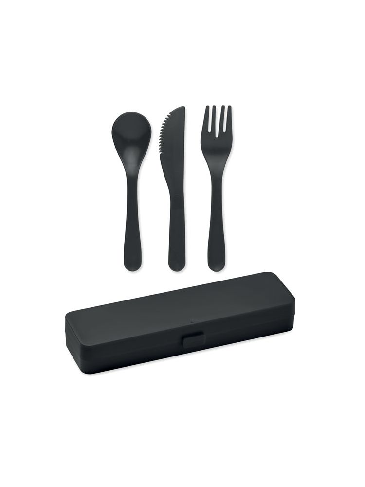 Zestaw przenośnych sztućców z PP wielokrotnego użytku i z etui. Zawiera łyżkę, widelec i nóż.