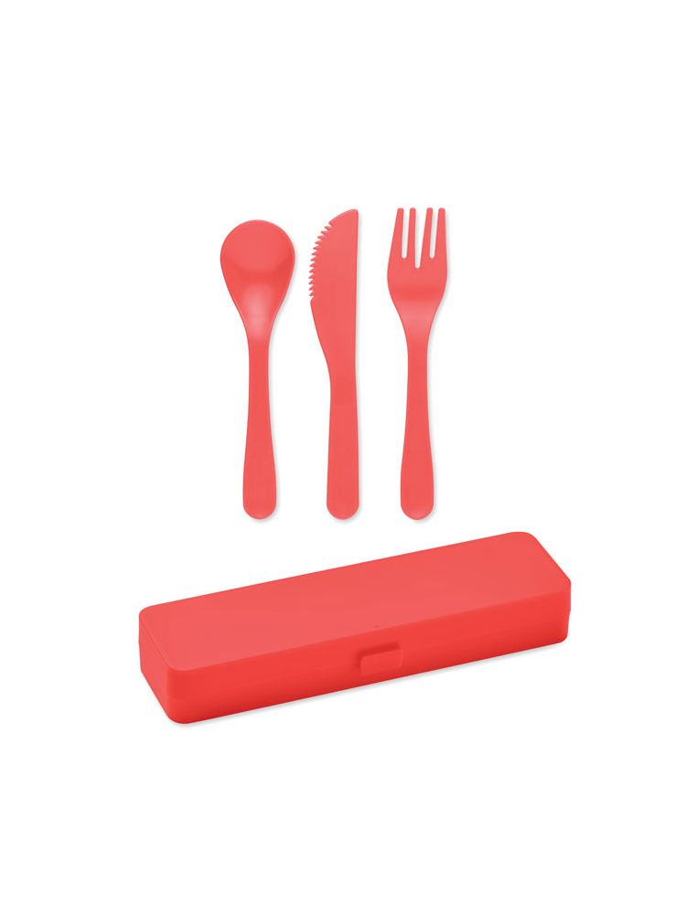 Zestaw przenośnych sztućców z PP wielokrotnego użytku i z etui. Zawiera łyżkę, widelec i nóż.
