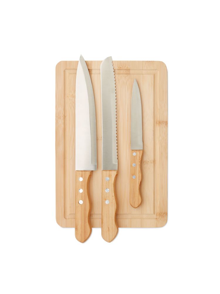 Zestaw desek do krojenia z bambusa z 3 nożami ze stali nierdzewnej z bambusowymi uchwytami: szefa kuchni, do chleba i do trybowania. Bambus jest produktem naturalnym, dlatego mogą wystąpić nieznaczne różnice w kolorze, wzorze i rozmiarze.