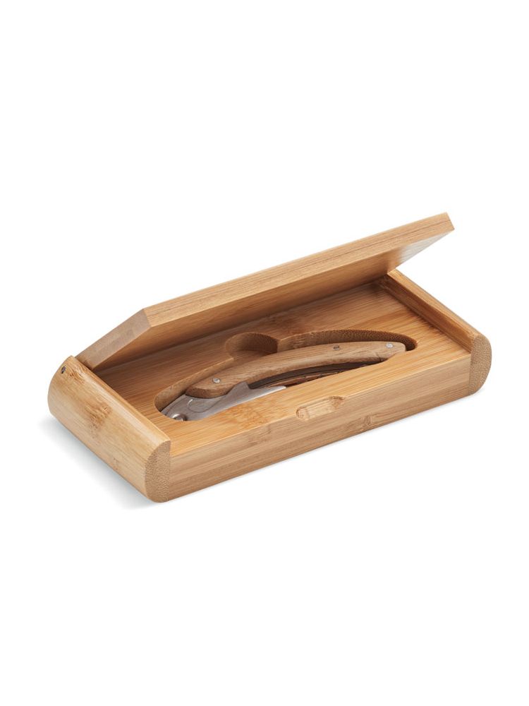 Oryginalny nóż kelnerski ze stali nierdzewnej z podwójnym korkociągiem i bambusową powierzchnią. Prezentowany w bambusowym pudełku upominkowym. Bambus jest produktem naturalnym, dlatego mogą wystąpić nieznaczne różnice w kolorze, wzorze i rozmiarze.